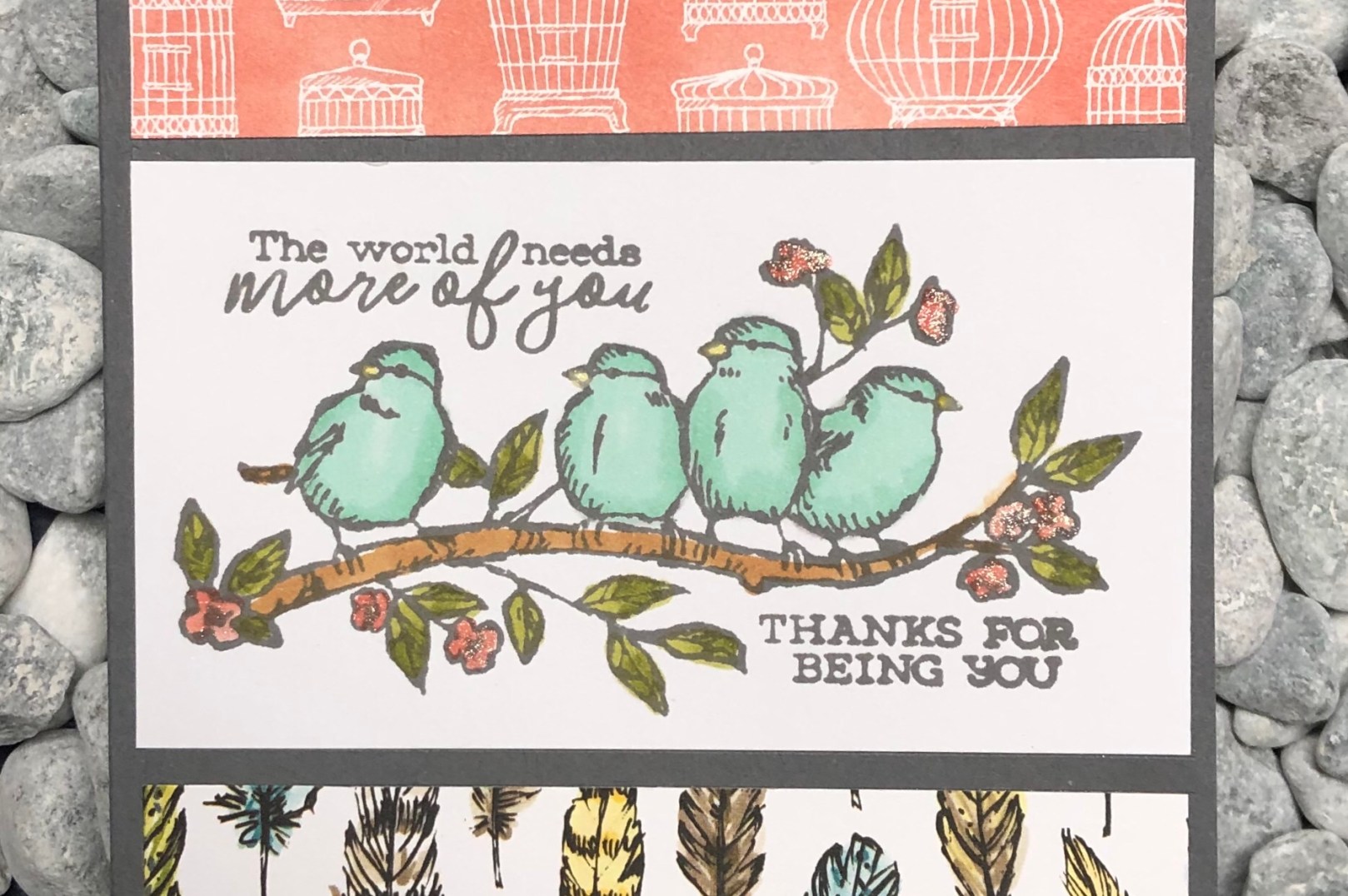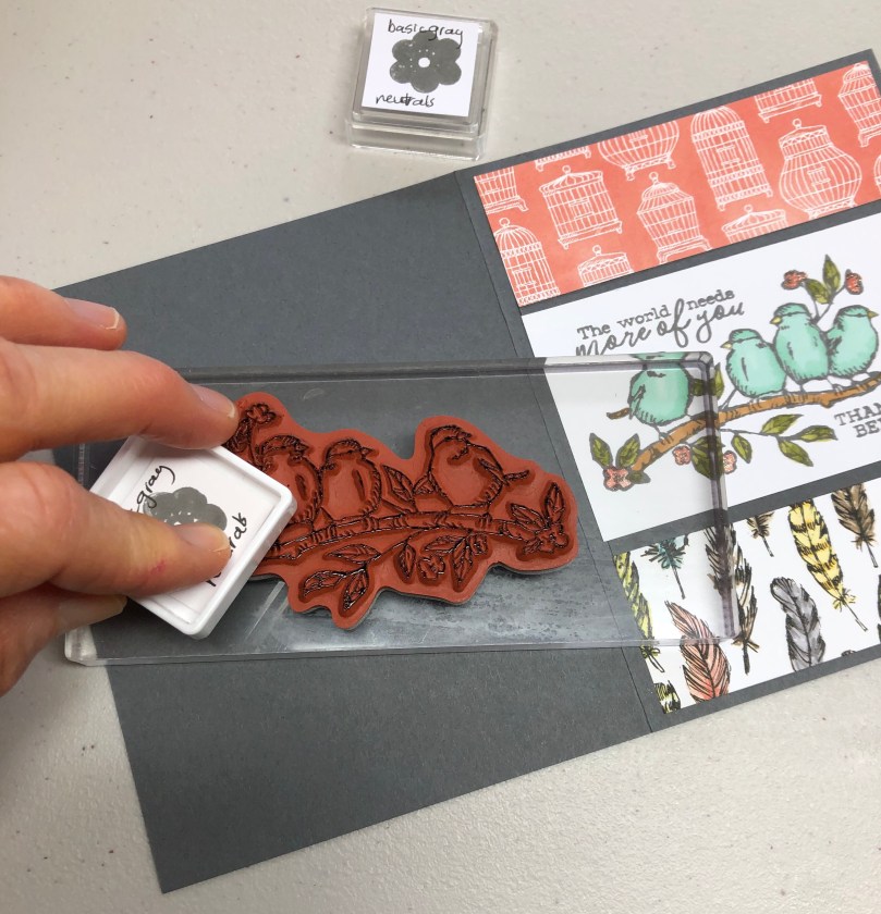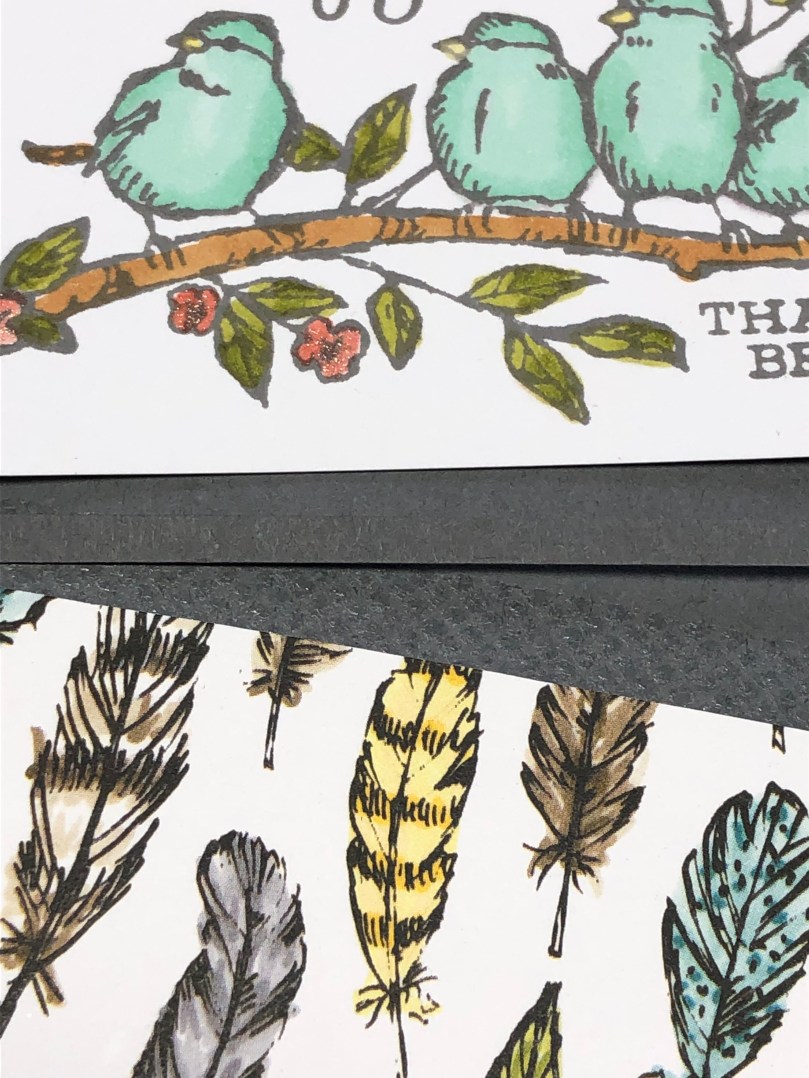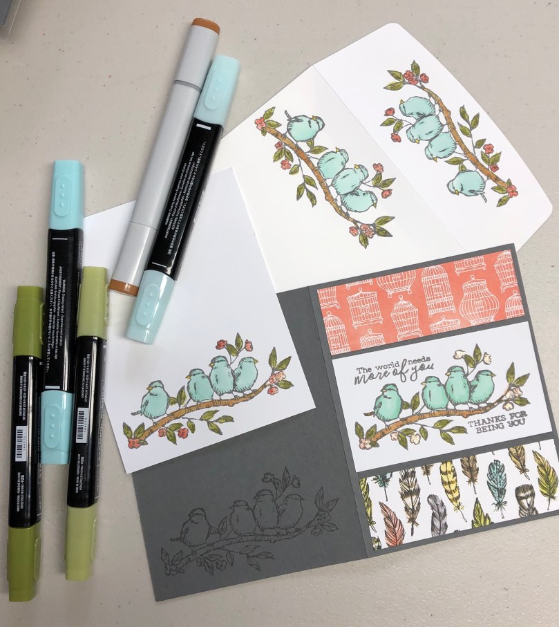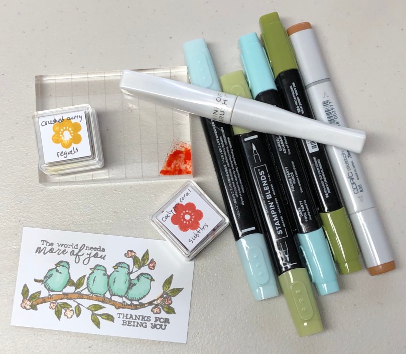 Colouring them was the next step. Like on the main card image, I mostly used Stampin’ Blends markers. So far I only have two colours (Old Olive and plus an old Copic brown marker. So I used a Wink of Stella brush to pick up the Calypso Coral ink from a block for the flowers and the same process for the Crushed Curry for the beaks. That added bonus of that method is that it adds a bit of glimmer.