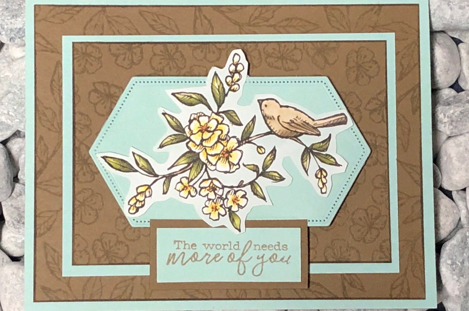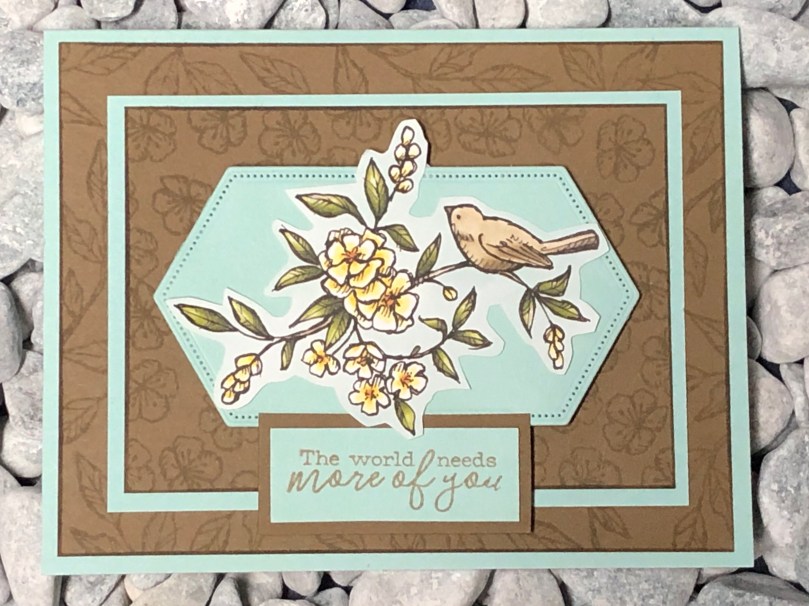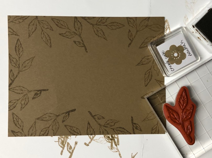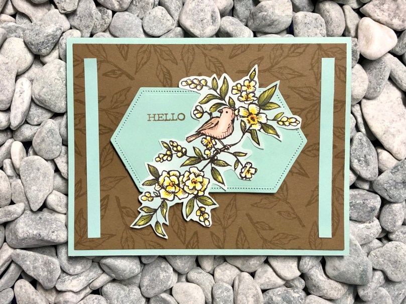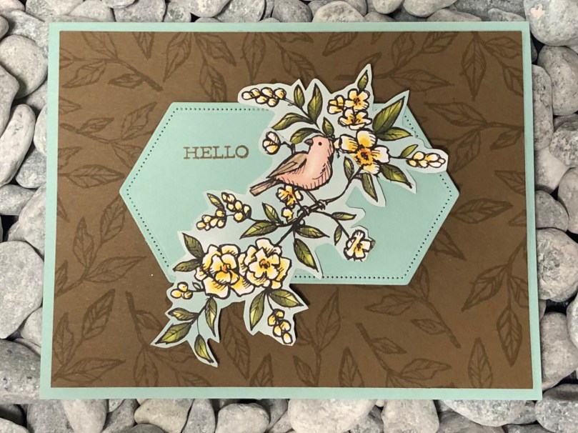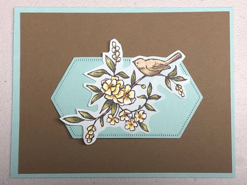 Colouring them was the next step. Like on the main card image, I mostly used Stampin’ Blends markers. So far I only have two colours (Old Olive and plus an old Copic brown marker. So I used a Wink of Stella brush to pick up the Calypso Coral ink from a block for the flowers and the same process for the Crushed Curry for the beaks. That added bonus of that method is that it adds a bit of glimmer.