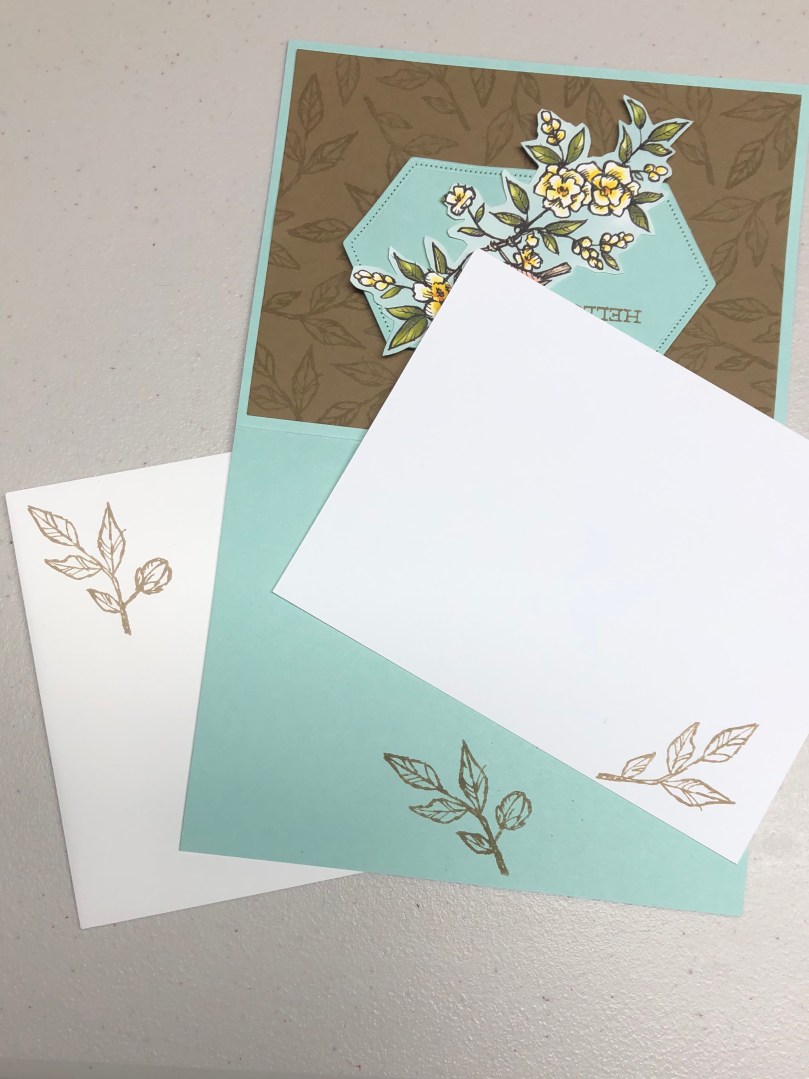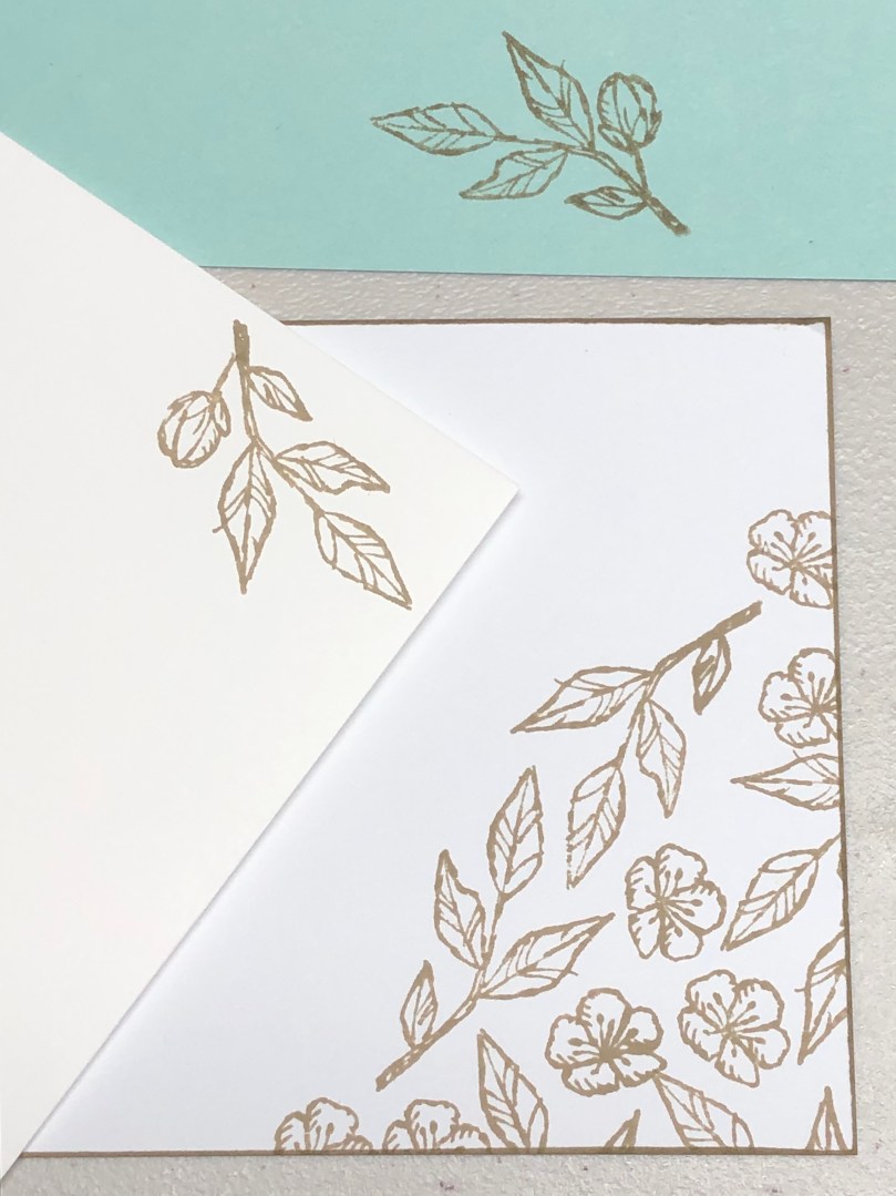 Then I stamped the image onto the back of the card, at the bottom of the the inside insert as well as on the envelope flap and top left corner.
