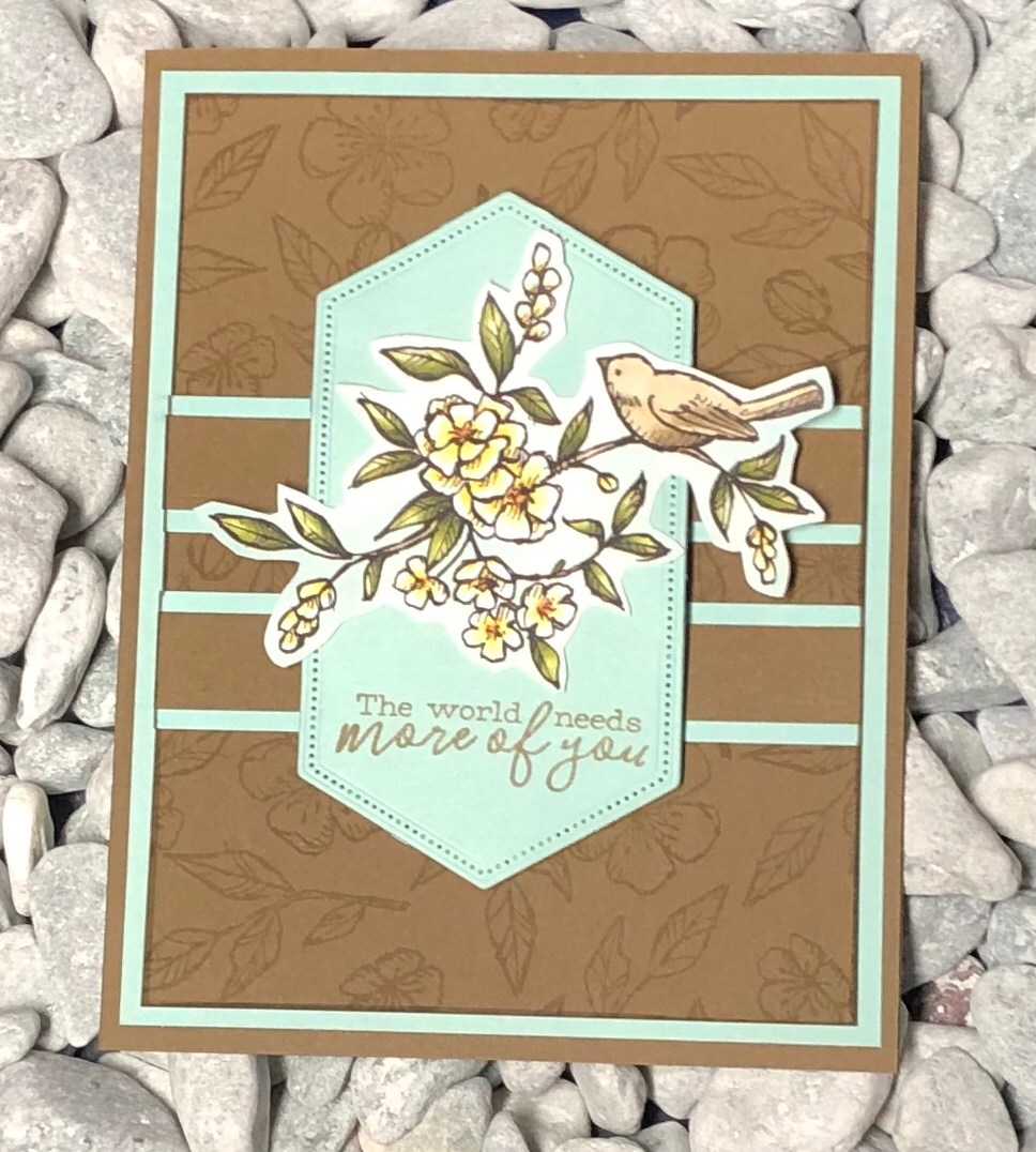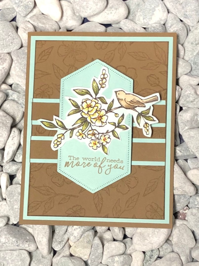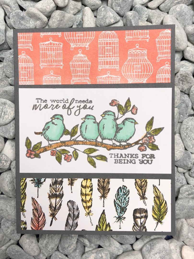 This layout is becoming a favourite go-to design. A stamped image in the centre with some Designer Series Paper (DSP) strips at the top and bottom with onset strips of the card base colour between the stamped image and the DSP.