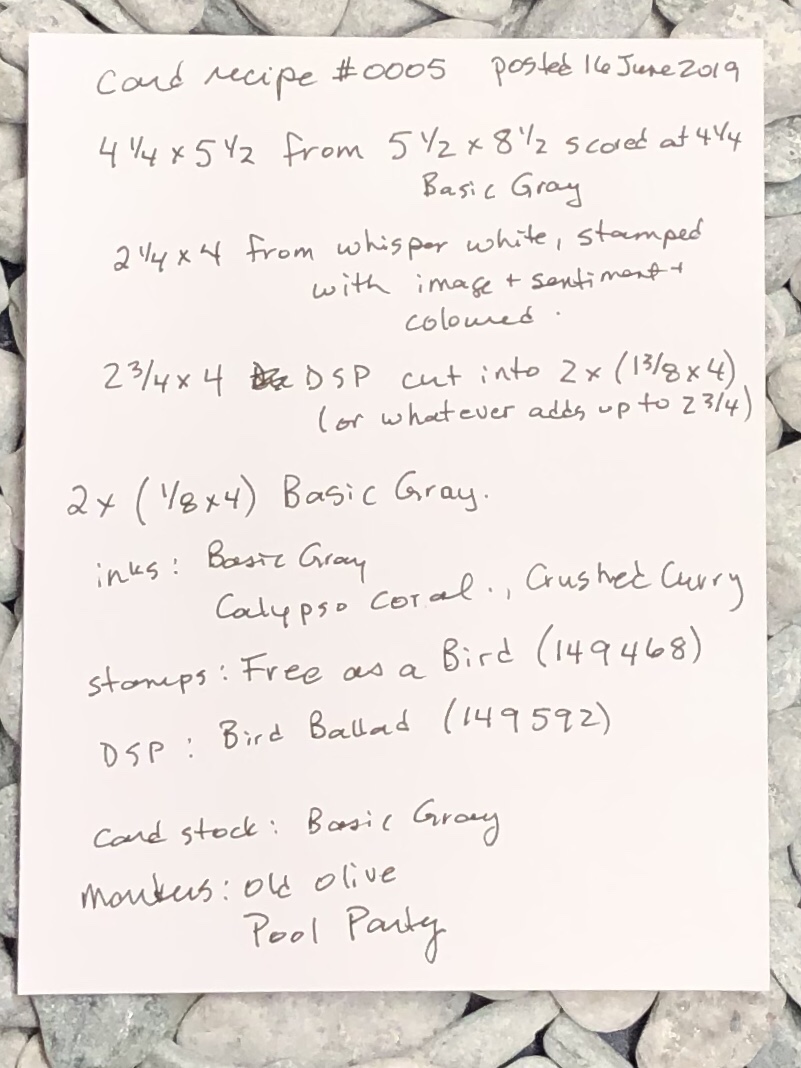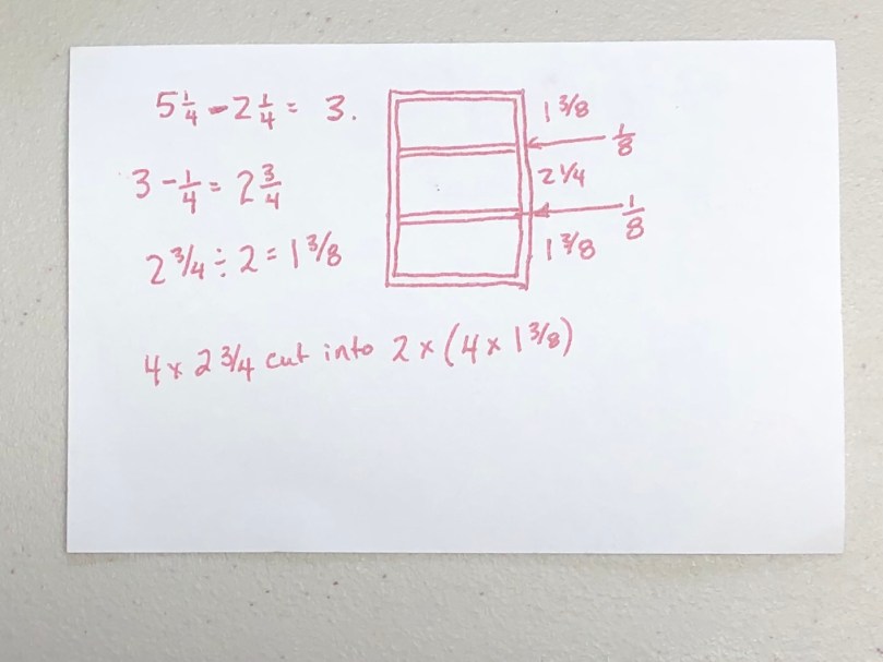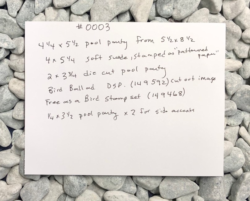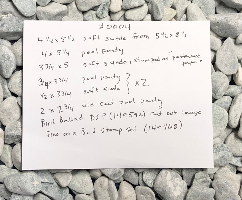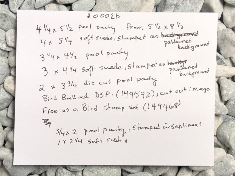 These are the pieces ready to be assembled. Since the base is 4-1/4×5-1/2, I wanted the rest of the pieces put together to be 4×5-1/4. The math is below. The stamped image piece is 2-1/4 high which subtracted from the 5-1/4 total I wanted left 3 inches for the DSP and spacers in total. The two 1/8 ‘spacer’ strips take a total of 1/4″ which left 2-3/4 for the total height of the 2 DSP pieces. I kept it simple and simply cut them in half to a height of 1-3/8″ each. But you can mix it up and have the top piece thinner or thicker than the bottom piece.