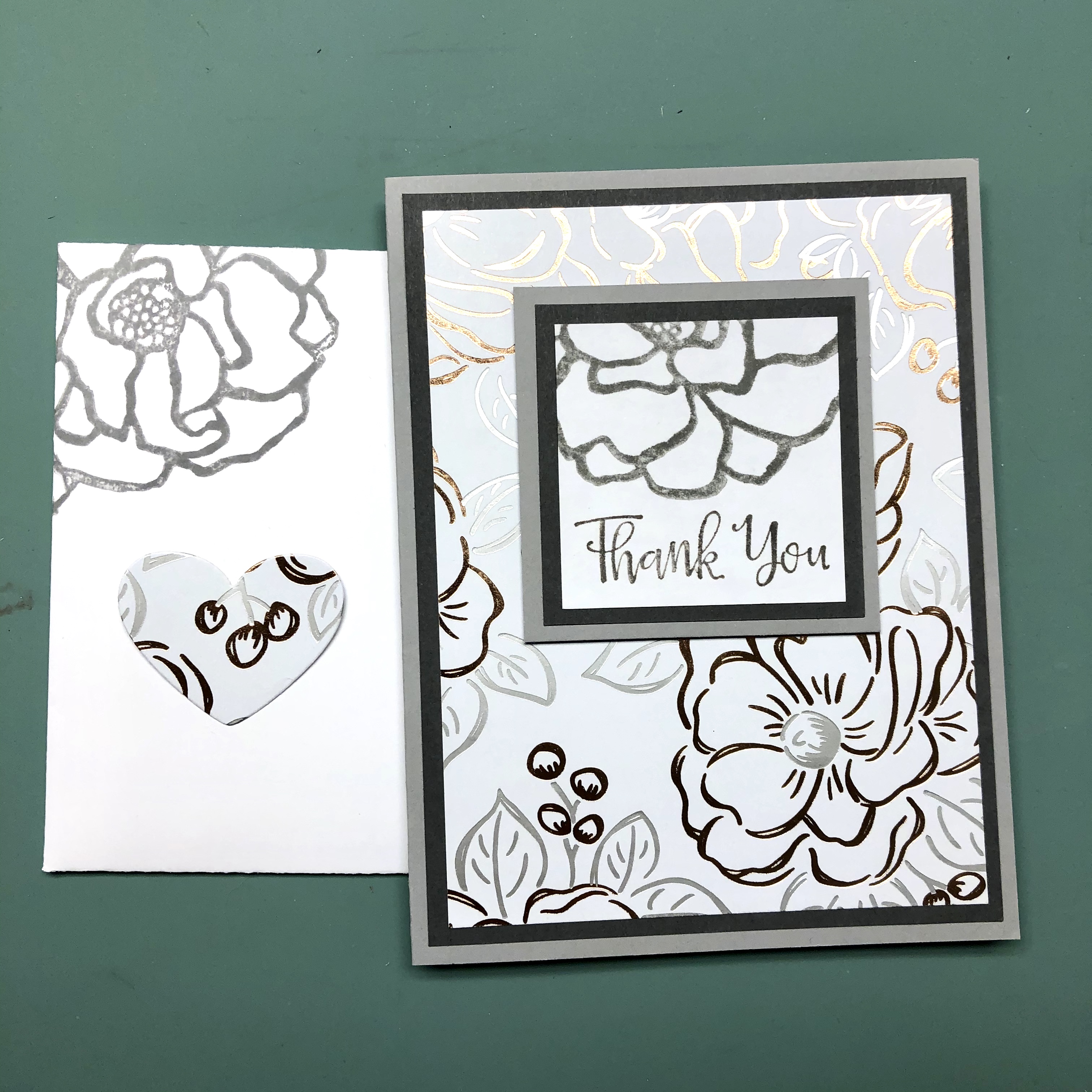 Today’s thank you cards were made using Stampin’ Up! paper, cardstock, ink and stamps including Designer Series Paper (DSP) Flowering Foils as well Basic Gray, Smoky Slate and Soft Suede. We are showing a few different colour combinations as well as the difference between matting paper with cardstock both 1/8″ and 1/4″ bigger than the patterned paper and sentiment block.This card was made using a smoky slate card base along with basic grey cardstock to mat the Flowering Foils Designer Series Paper (DSP) from Stampin’ Up!. The basic grey cardstock is 1/8″ bigger than the 3-3/4″ x 5″ patterned paper.This card was made using a smoky slate card base along with basic grey cardstock to mat the Flowering Foils Designer Series Paper (DSP) from Stampin’ Up!. The basic grey cardstock is 1/4″ bigger than the 3-3/4″ x 5″ patterned paper.This card was made using a soft suede base along with basic grey cardstock to mat the Flowering Foils Designer Series Paper (DSP) from Stampin’ Up!. The basic grey cardstock is 1/8″ bigger than the 3-3/4″ x 5″ patterned paper.You can notice the difference in the look of the card depending on the colours of cardstock that you use to mat your patterned papers. The left card’s base is smoky slate with the patterned paper matted with basic grey. The right-hand card’s base is soft suede (showing darker than it actually is) with the patterned paper matted with smoky slate.