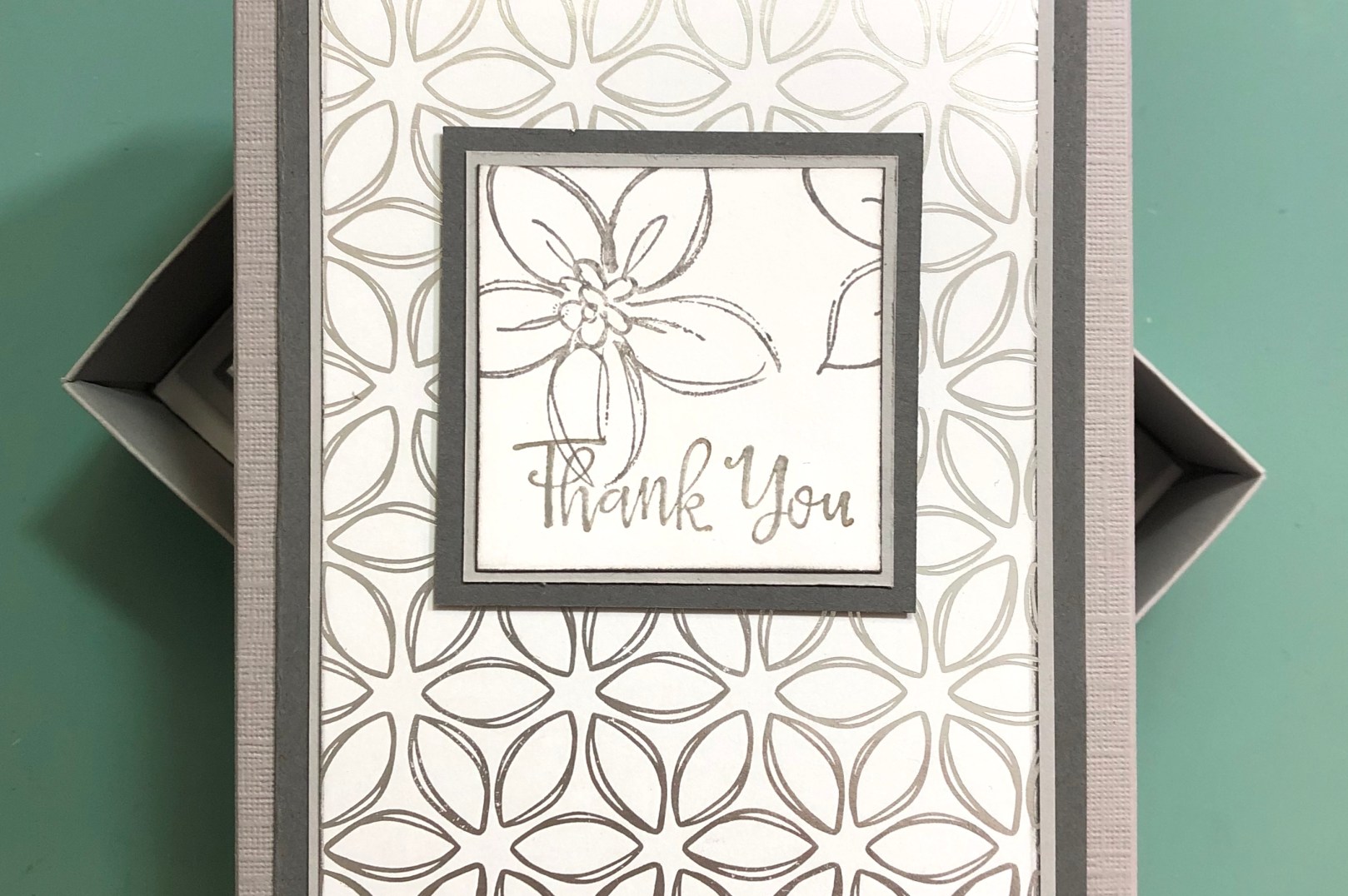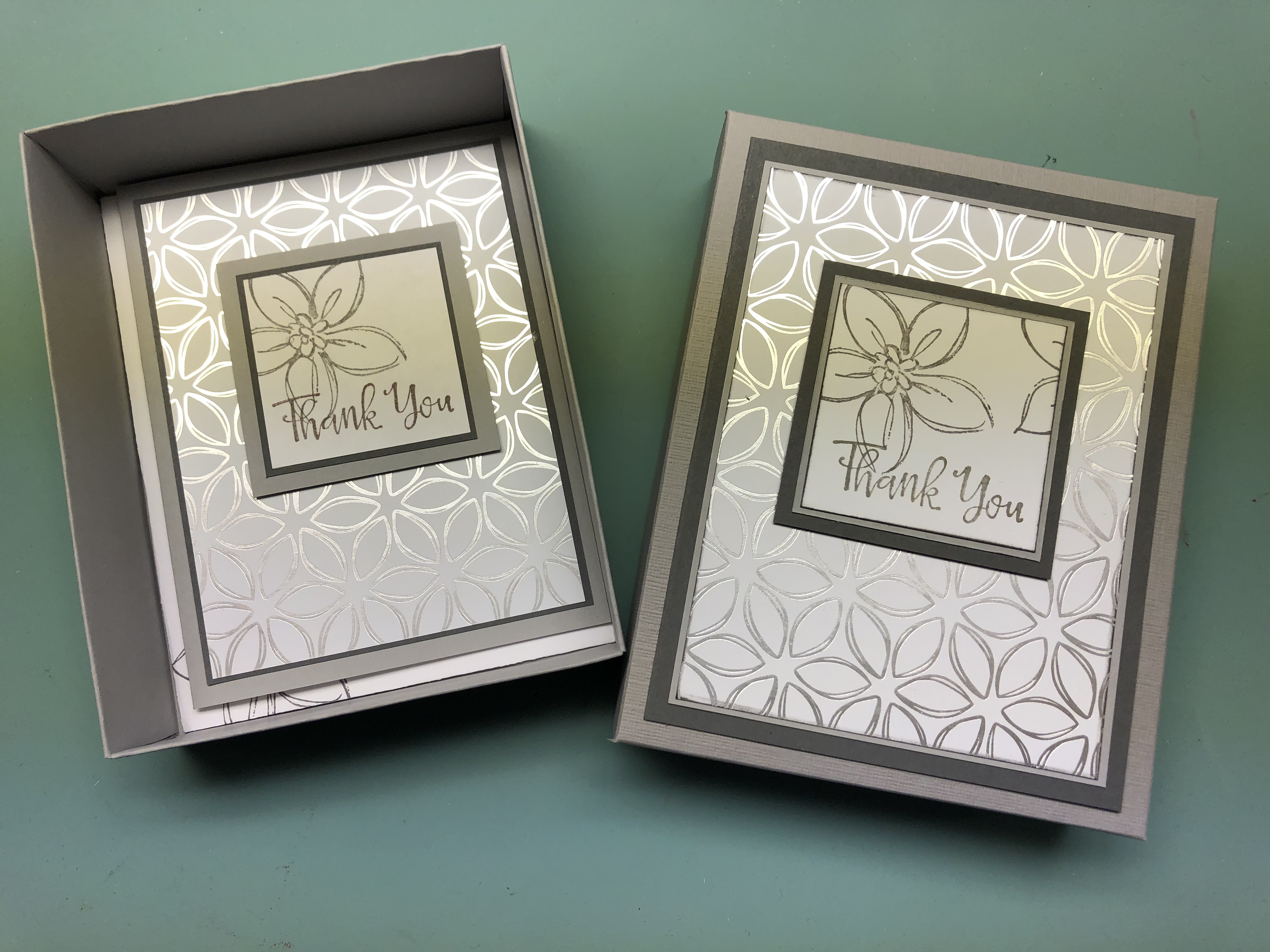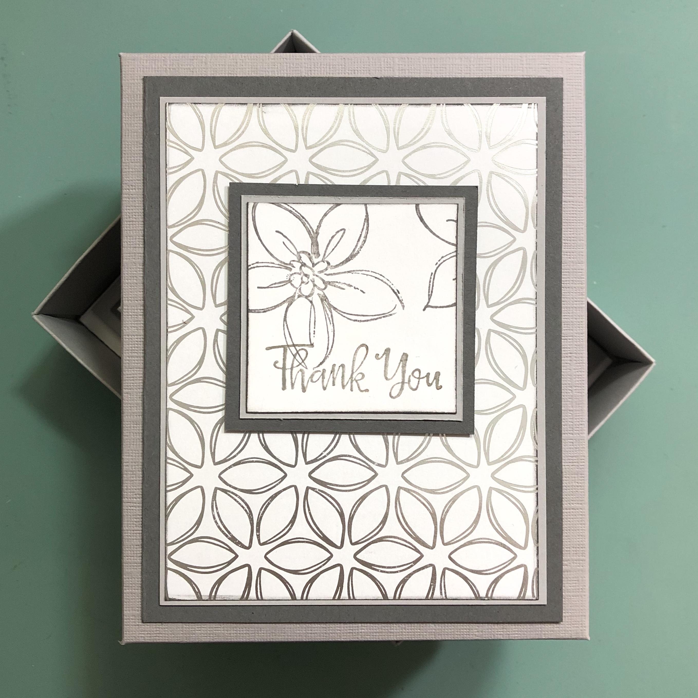 Today’s box holds A2-sized (4-1/4″ x 5-1/2″) cards. The box is 1-1/2″ deep, 4-3/4″ wide and 6″ long. It’s made using Stampin’ Up! papers, card stock and stamps. The colours are Going Grey and Smoky Slate. The Designer Series Paper (DSP) is from the Flowering Foil pack.Today’s box holds A2-sized (4-1/4″ x 5-1/2″) cards. The box is 1-1/2″ deep, 4-3/4″ wide and 6″ long. It’s made using Stampin’ Up! papers, card stock and stamps. The colours are Going Grey and Smoky Slate. The Designer Series Paper (DSP) is from the Flowering Foil pack.Today’s box holds A2-sized (4-1/4″ x 5-1/2″) cards. The box is 1-1/2″ deep, 4-3/4″ wide and 6″ long. It’s made using Stampin’ Up! papers, card stock and stamps. The colours are Going Grey and Smoky Slate. The Designer Series Paper (DSP) is from the Flowering Foil pack. Recent ‘3:00 Thanks’ blog posts and videos show how to make the coordinating cards to go in the box.