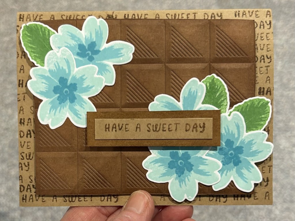 Overall I am fairly pleased with how this card came out. I had been wanting to try mounting the chocolate bar onto a lighter coloured background – I think the ‘Have a Sweet Day’ stamp set made it a bit last jarring than it would have been to have had a plain kraft background. I could have been a bit more careful stamping the sentiment on the background – but it’s good enough. I had overinked my stamping spot so I smudged a few spots and had some inconsistent darkness to some of the words. I do like the sentiment mounted onto the bigger brown rectangle; it would have been nicer to have had that brown rectangle being 3 squares of the chocolate bar embossing folder. I had made the brown of the chocolate bar and the brown rectangle by ink blending Dusty Rose and/or Toasted Mauve ink. I think that gave a bit nicer texture / dimension than when I had embossed the chocolate bar out of brown cardstock. I think my flower clusters worked out okay. I like how there are three on the bottom right and two on the top left. I may add in some glitter pen, glossy accents or enamel dots into the centres of the flowers. Perhaps it would have been better to have placed the sentiment a bit more to the left so that it wasn’t covering a flower centre. It might be interesting to see how it would have looked if I had used white rather than kraft cardstock for the background and the sentiment strip. I also think that a scripty larger die cut sentiment might have been nice instead of the smaller text of the Have a Sweet Day sentiment strip. I had tried to clear emboss the sentiment onto a kraft cardstock strip which I then ink blend with the brown ink, but I didn’t like how that had turned out. I had also tried an ink blended (rather than repeating sentiment stamped) the card front. But I had used a lighter weight cardstock that wasn’t really suitable for a card base. And then when I opened door 19 to find the sentiment stamps, I thought it would be more interesting to use it on the background layer rather than having a solid ink blended brown background layer. I think the lighter weight cardstock of the embossed chocolate bar and the heavier weight cardstock of the sentiment strip have taken the ink blending a bit differently, but the colour may be slightly different because I used a different colour of brown ink that I thought I had – it would have been better to have done them both at the same time and with the same cardstock.