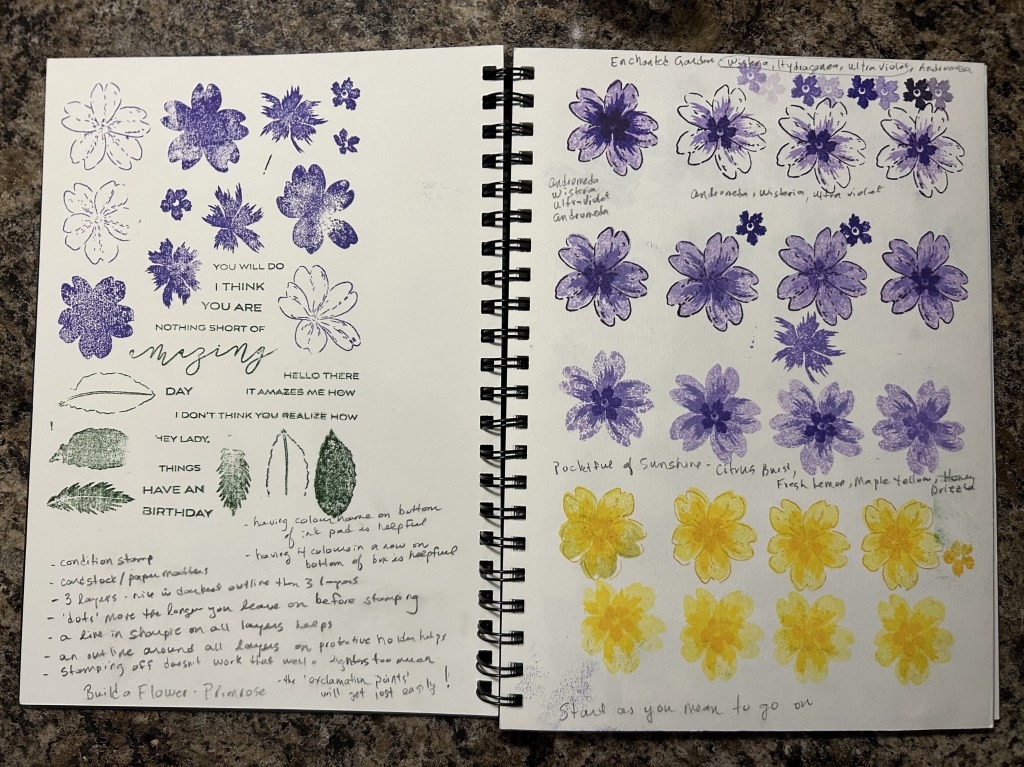 - The light ink colours don’t ‘stamp off’ or do that well with ‘multi-generation’ stamping but that is an option to get ‘different’ colours of ink for the various layers. But I found it easiest to just use the different ink colours that come in the 4 ink sets. They are packaged like that for a reason: they make it very easy to create beautiful multi-layered stamped flowers.