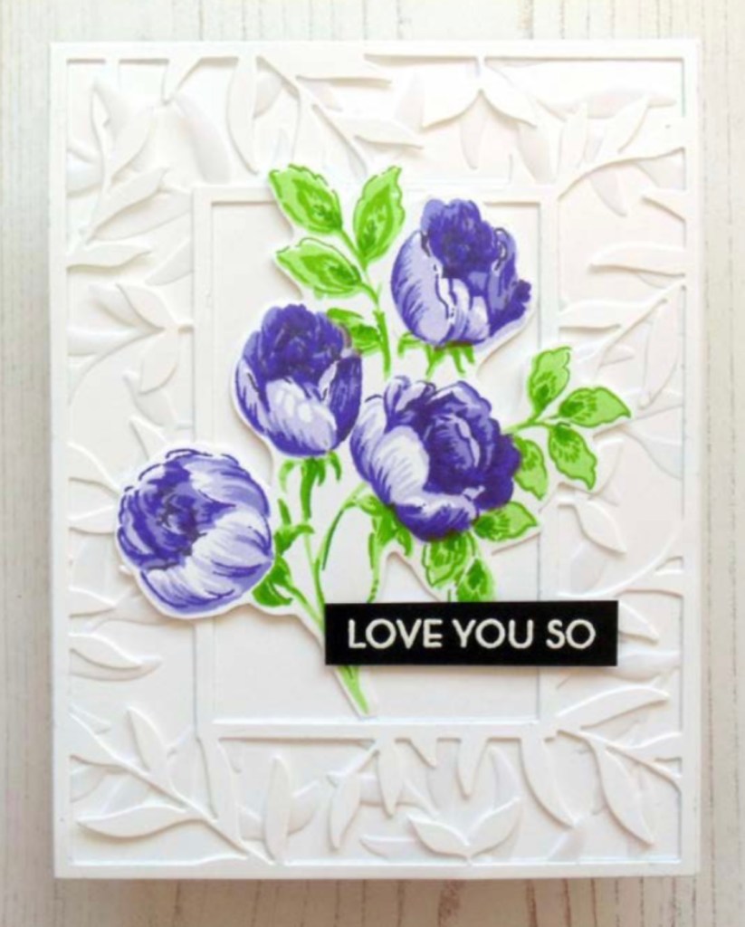 To make the frame, I embossed a 4-1/4″ x 5-1/2″ piece of white cardstock using the deck planks embossing folder. Then I cut apart each plank. I adhered the 4 edges of the frame in the centre only onto the card front. Then I mitred the corners and adhered the rest of the frame to the card front. In the future I might try making the frame from coloured cardstock or ink blending the planks. But I was trying to mimic the design of the card in class which had a white leafy frame. I have added that versatile leaf frame coverplate die to my wishlist.
