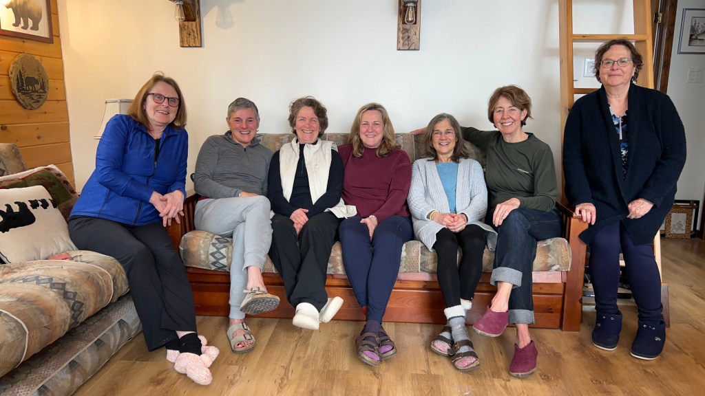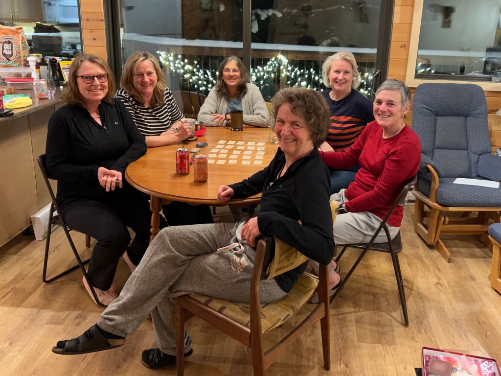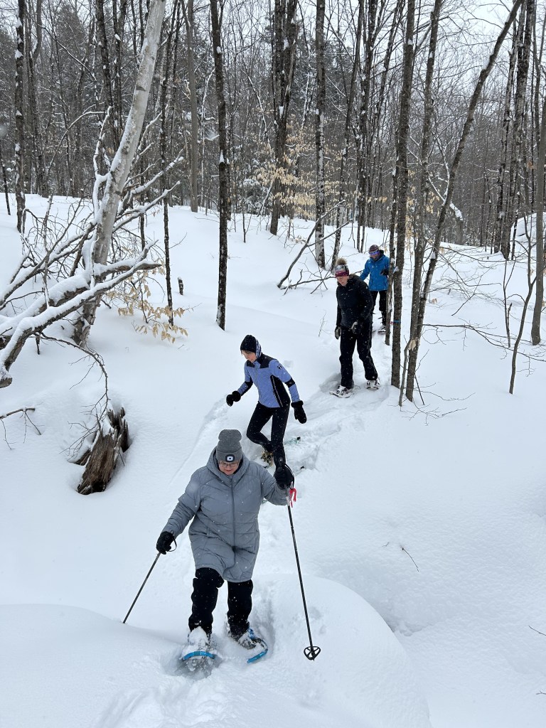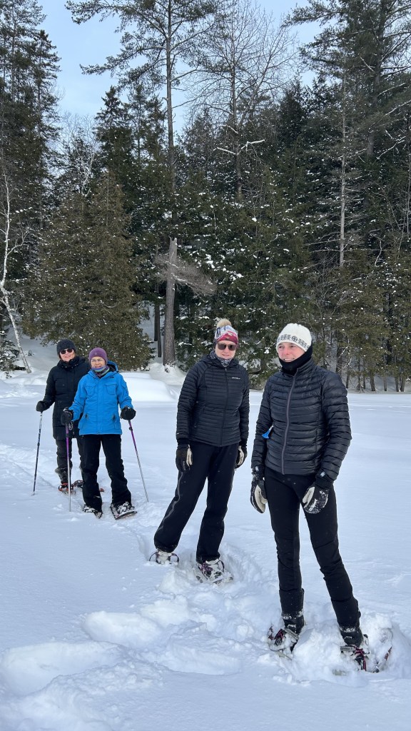 We had a great breakfast then set out for some snowshoeing. 4 of us stuck with the trails through the woods which were terrific and 2 headed down to the lake. Another friend arrived about 3:00 and we shuttled one car out (it wasn’t 4 wheel drive as I had thought so we figured we might as well drive it out to leave at the mailboxes today rather than tomorrow. We made some reasonable progress on the puzzle and had a few fun games of Bananagrams and Codenames after our delicious fondue dinner.