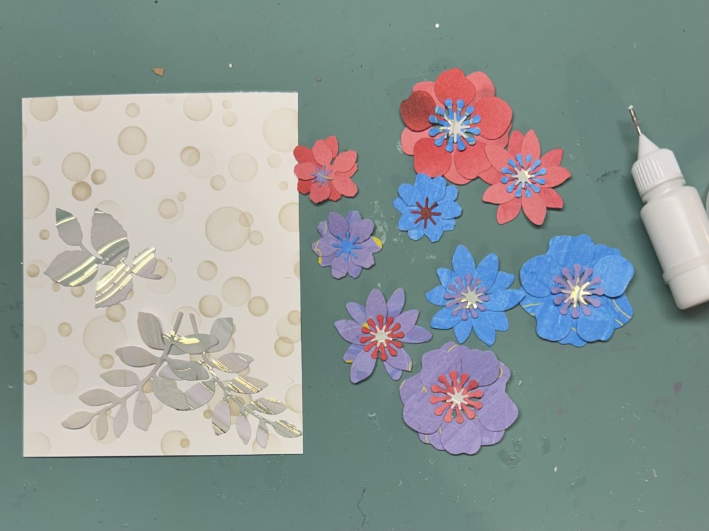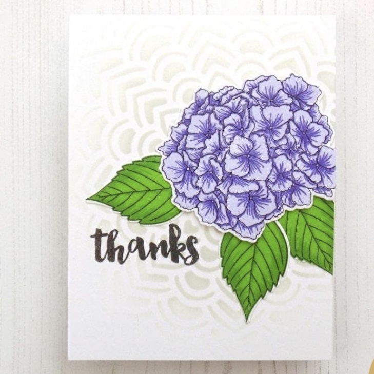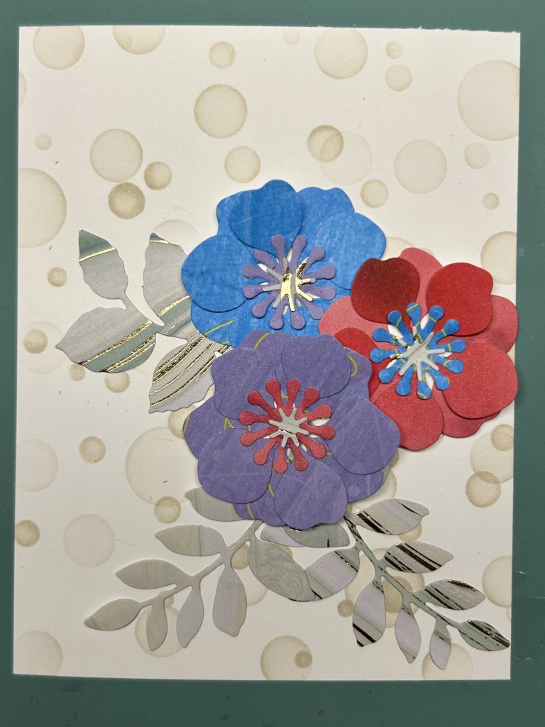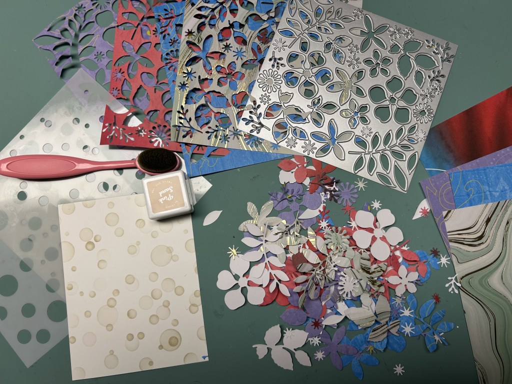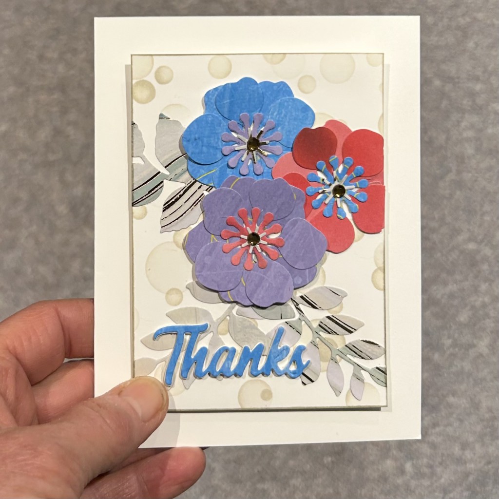 Card for Altenew All About Layering 3 – Lesson 6 // 100DayProject Card 6I made my background by blending Pink Sand Altenew ink with stencils from Concord & 9th and another company. I used the Altenew Zero Waste die from Lush Garden Crafty your Life Project kit to cut out lots of flowers and leaves from white-backed pattern paper. I thought I could use the white sides on a later project by colour blending them with ink. The thank you die is Pink Fresh Studio.I adhered some leaves and assembled some flowers but only ended up using the three large flowers on this card.I didn’t like how there was too much space up at the top. Perhaps a sentiment may have fit there but it seems off balance. So I trimmed it down from 4-1/4 x 5-1/2 to 3-14 x 4-1/2, inked the edges, put some foam behind it and put it onto the card front. My end result would have been more similar to the sample card design if I had taken a bit more time to figure out the whole layout instead of adhering the leaved down before I had figured out the whole design including how many flowers and the size of my sentiment.This is the inspiration card from All About Layering 3 Lesson 5