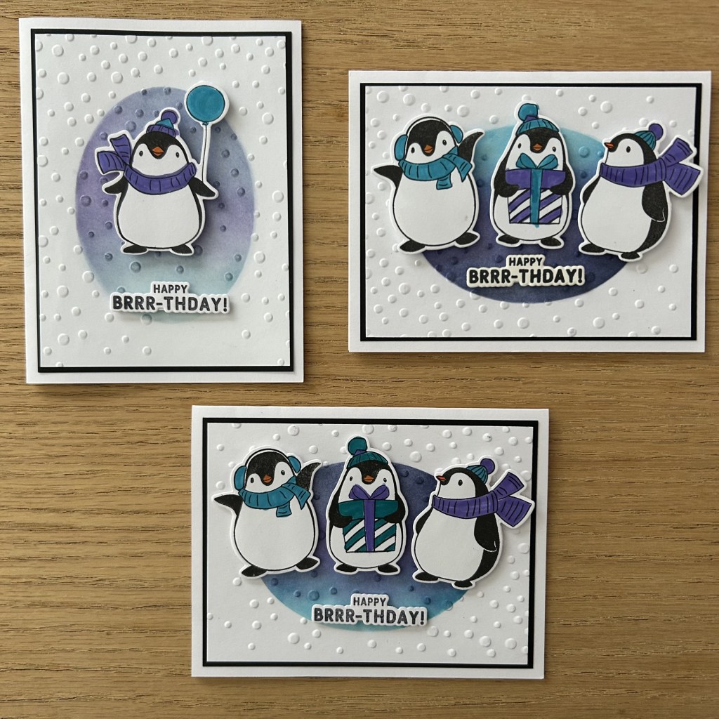 These are the cards that I made today during the online class I gave for the Dementia Society. Such a fun set of penguins from a Simon Hurley kit in a Scrapbook and Today Crop and Create kit. The oval was blended using a Gina K stencil. The snowy background is a Taylored Expressions embossing foler.