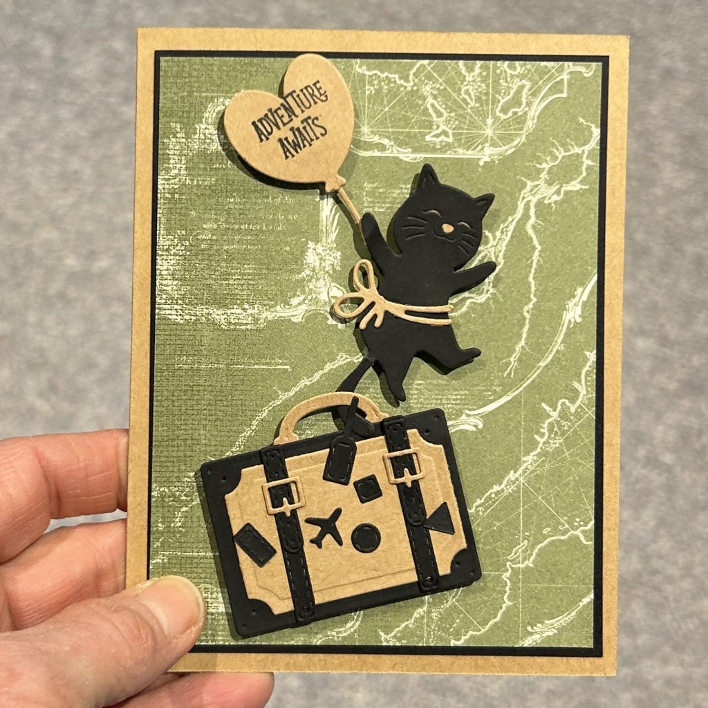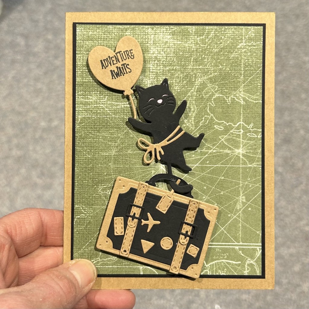 This was created using the suitcase die from Spellbinder Advent Calendar door 24. Yes, I have finished my final card from that project. But I do look forward to incorporating all the products in future projects. The cat die is from door 23. The patterned paper is from Stampin Up! as is the Adventure Awaits stamp (from a Paper Pumpkin kit).I had two cats already die cut so made two cards. I made the suitcases opposites. I think I prefer the Kraft accents on a black suitcase base rather than the other way around adn think it would be better with a Kraft rather than black handle.