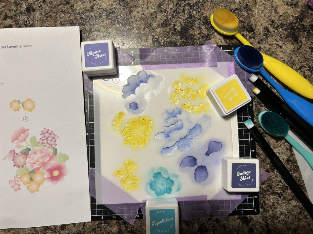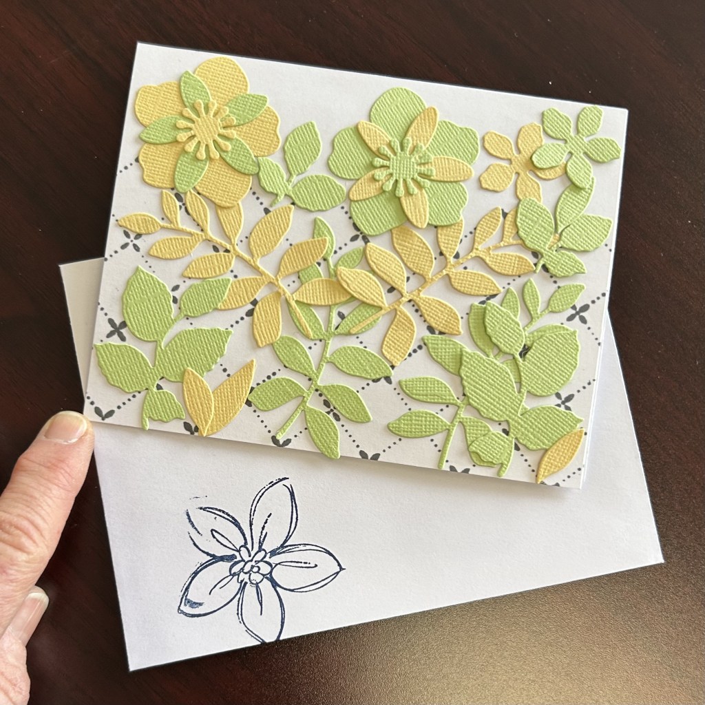 The card making at Card Crew went very well this afternoon. We had 3 ladies living with Dementia in attendance today plus a volunteer and a caregiver as well as the caregiver’s daughter who happens to be off on March Break. I’m including a sample of one of the cards that was made. I meant to take photos of all of the cards that they made but forgot. Other than the diecutting of the ‘zero waste’ flower/leaf die, the participants (with a bit of help from others) did all of the steps of making the cards themselves including stamping (using a MISTI) stamping platform, stamping using traditional wood-mounted rubber stamps, ink blending and cutting out sentiments. It was very helpful to have adhesive-backed cardstock to die cut – it made the cards much simpler to put together for the participants than if they had had to use glue. I am hoping to buy some more adhesive-backed cardstock since it is really a great option for participants living with Dementia. We peeled the backing off for them, but they were easily able to place their flowers and leaves. I had everyone use some wood-mounted alphabet stamps at the beginning of class to make name cards. I plan to do that every class to get the participants more familiar with the process of stamping. I think it is easier to have them use wood-mounted stamps rather than using acrylic blocks and photopolymer stamps.