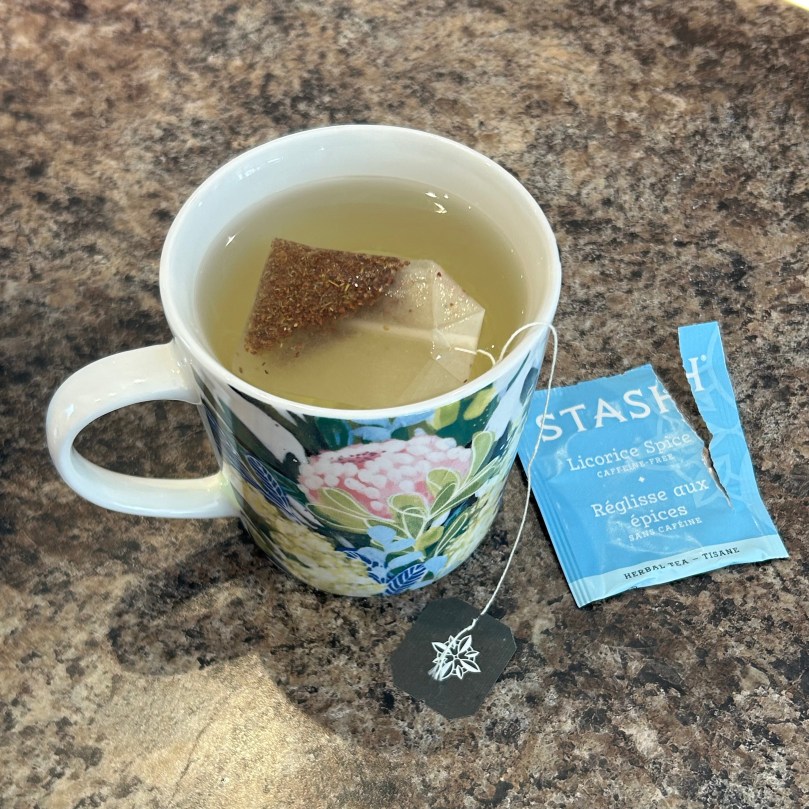 licorice tea and the lovely tea cup that Lynda gave me several years ago … and for the other favourite tea flavours and mugs that I have on hand to warm up my mornings.