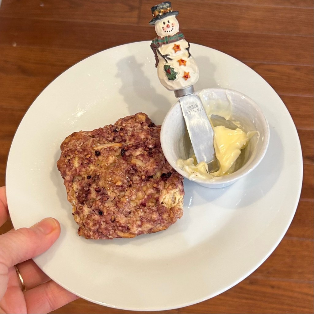 blackberry almond scones from Vicki … and having Stef home for the weekend and being able to share one with him freshly warmed up from the freezer …