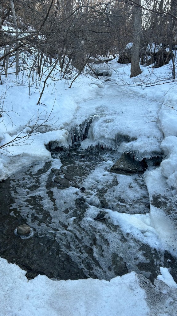 Another benefit of the freezing and thawing cycles is the ever changing beauty of the icy falls in the small stream on my walk. Through my Headspace app and their great collection of videos I am gradually learning to embrace the mindfulness attribute of impermanence. Like so many things in nature, our thoughts, feelings and the things that are happening around us are everchanging. At this time of year in particular, I love to see how the stream looks different each day.