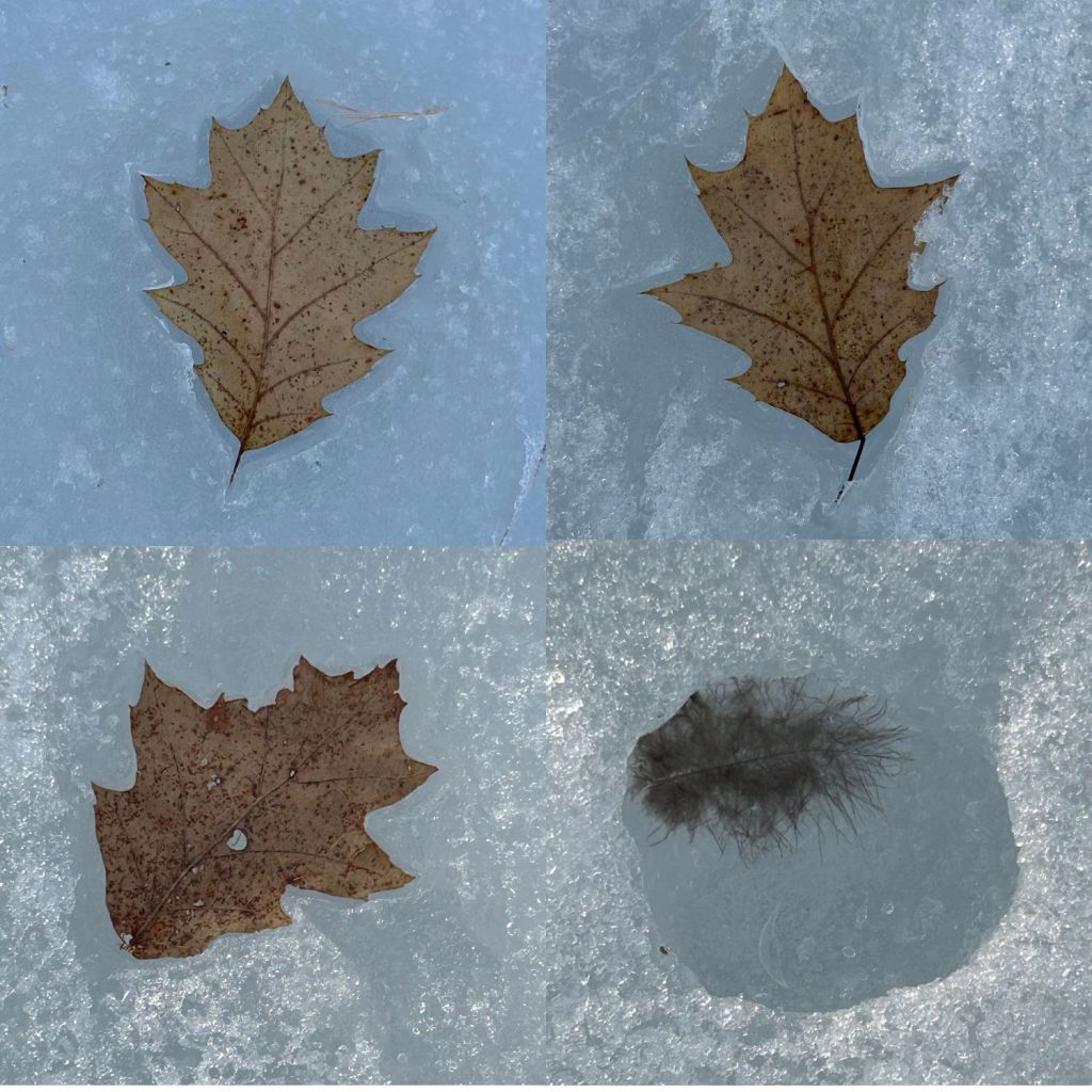 The cold nights have helped to make walking on the lake at the cottage possible as well. I went for a few walks with Luna and Roland. It may be too soft for the next few days since it isn’t going down to freezing over the next few nights. I really love to see how the dark colour of the leaves (and the occasional feather) causes the ice to melt in the bright sunlight and creates small watery holes into which the leaf or feather sinks.