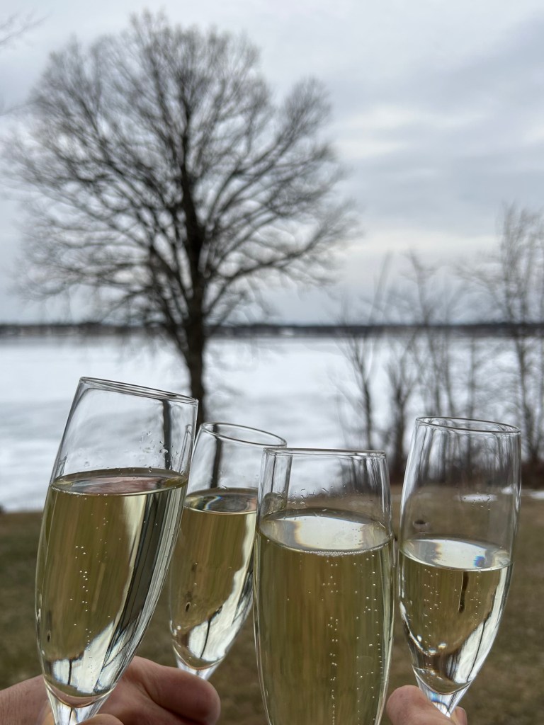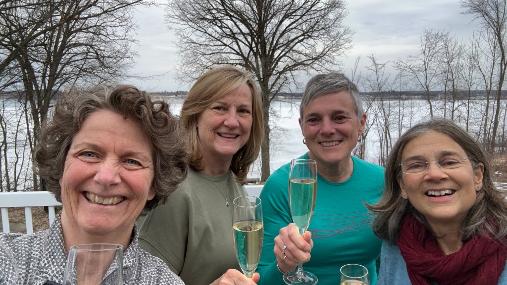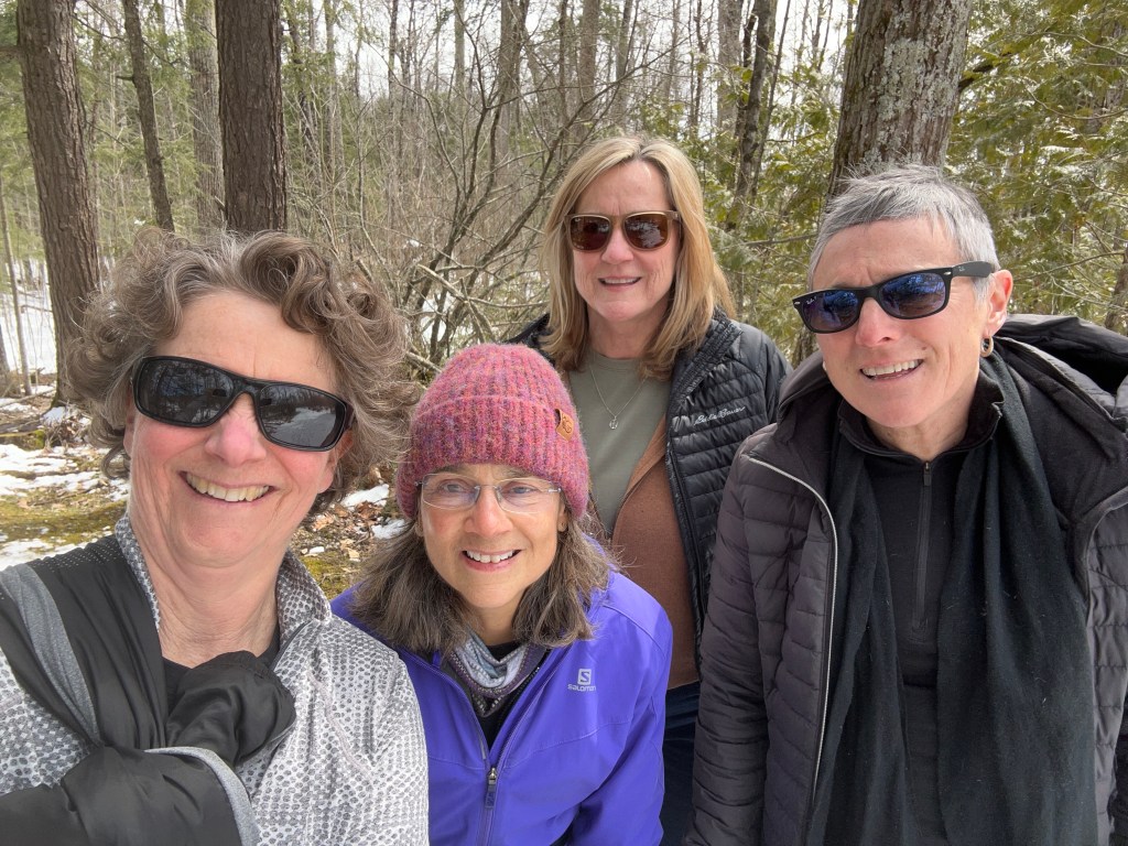 We had a relaxing, slow start to the morning. Cathy left about 10:00 after a simple but delicious breakfast of granola, yogurt and fruit. Danielle left closer to noon then the remaining 4 of us walked over to the Chateau, the trails through the forest and along the river are very pretty with snow still covering a lot of the ground and the paths not too messy from the melting yet. We came back for a simple lunch of soup, veggies, cheese, crackers and cookies. Flora and I walked into town for coffee and milk while Karen and Sheela stayed back to read. We had a delicious soft taco dinner inspired by the delicious dinner that Nancy had served us last Wednesday at bookclub. Flora whipped up some mango salsa to go along with the roasted cauliflower, the fried halloumi cheese and the avocado dip. We had no room for dessert. We played Bananagrams as well as Code Names. A great day filled with lots of activities and friends.