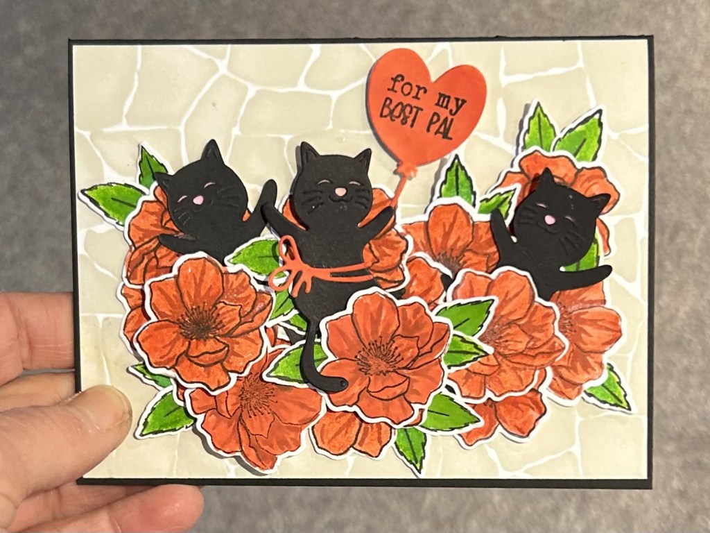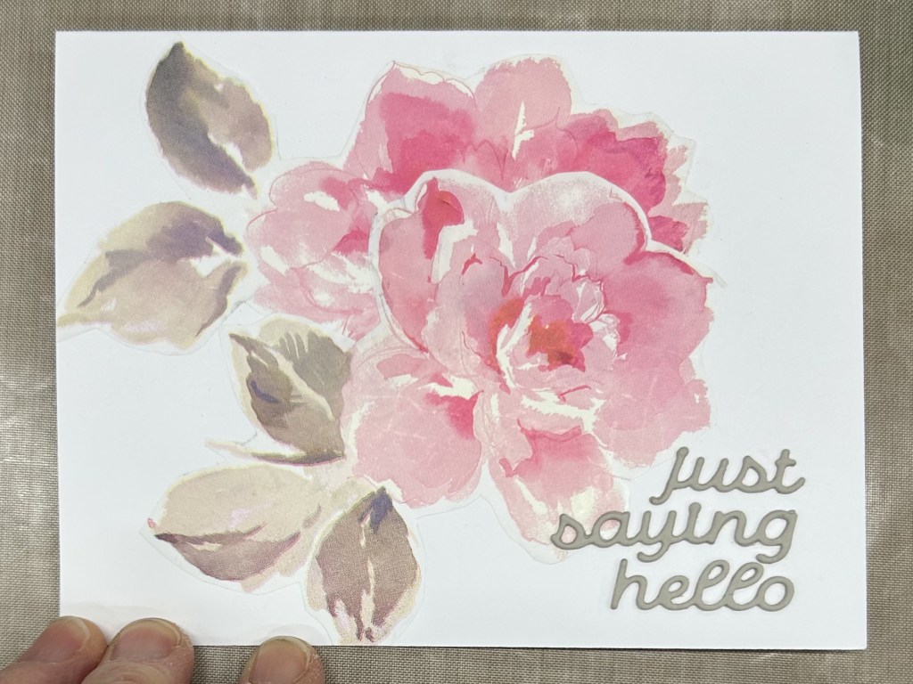 Phew, I stayed up way too late (it’s now almost 11:40), writing this post then deciding to finish off Cards 43a and 43b. I was pleased with how the ‘gold dipped’ effect on the bottom of my hello sentiments turned out using foil applied over the dried transfer gel. I had a sort of pinkish foil which turned out to go quite well with each of the pink colours as well as with the goldish/bronze of the pen that I had used to draw over the stitches on the die cut pocket as well as the stitches I drew in with a ruler around the edges of the cards. I should have used an uncut top cutting plate because the texture from the cutting plate came through onto the foil when I ran it through my die cut machine to better press the foil into the dry but still tacky transfer gel. It is also quite difficult to capture the foiled portions of the sentiment on the cards in photos, especially since I don’t yet have a new overhead light in my basement craft room.