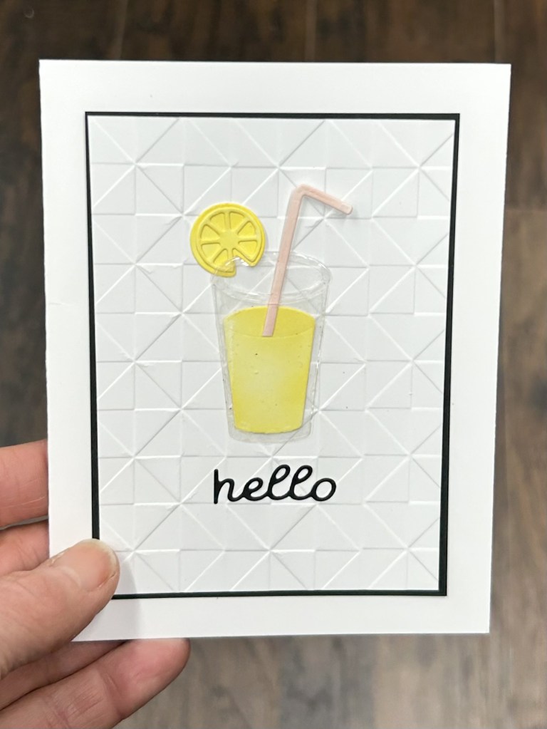 I used the Spellbinders door 11 geometric embossing folder. I really like how the geometric pattern contrasts with the curved lines of the glass and lemon. Having the background in white allows there to be some texture while not drawing too much attention away from the focal point of the fruity drink. I might have tried to emphasize the curvy edge of the drink a bit more and could have cut the straw just a bit shorter so that it was in the centre of that oval at the top of the drink. I could have tried a pink or yellow hello instead of the bold black, perhaps I could have also added a few pink or yellow enamel dots or sequins for a bit of bling to step the card up just a bit. I’ll have to find some coordinating stamps to decorate the inside and back of the card as well as to make a coordinating envelope.