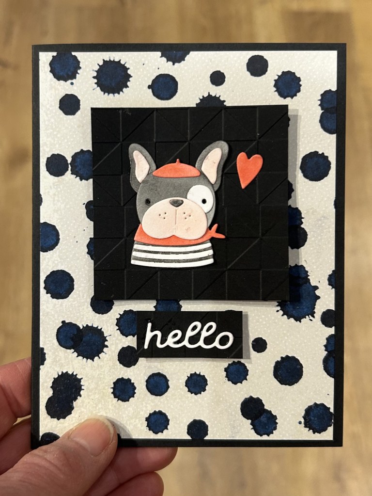 Even though I don’t love putting together tiny die cut pieces, I do love how this cute fellow turned out. I do wish I had had some adhesive-backed cardstock on hand to make the assembly easier, but the fine-tipped glue bottle certainly helped. Rather than using coloured cardstock, I die cut all the pieces from white cardstock then ink blended them. I used black ink to make the grey colour as well as Altenew Blush for the pink and Crimson for the red. I used a black pen to colour in the eyes. I thought that the ink-splatted paper from an old Scrapbook and Cards Today (SCT) Crop and Create online class had the right amount of spunk to go with this saucy pup. I used the Spellbinders door 11 embossing folder on the black cardstock to give it some fun geometrical dimension.