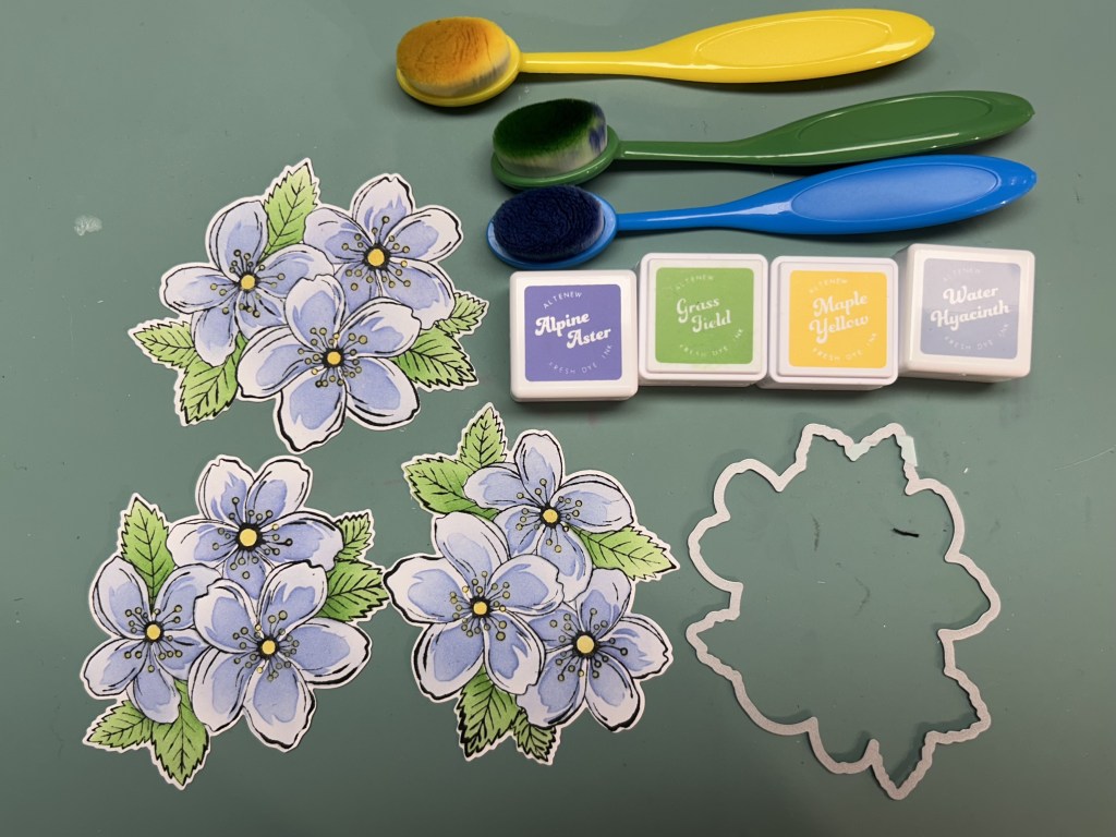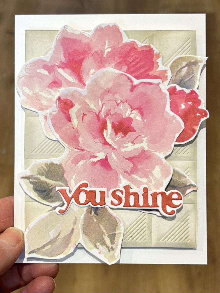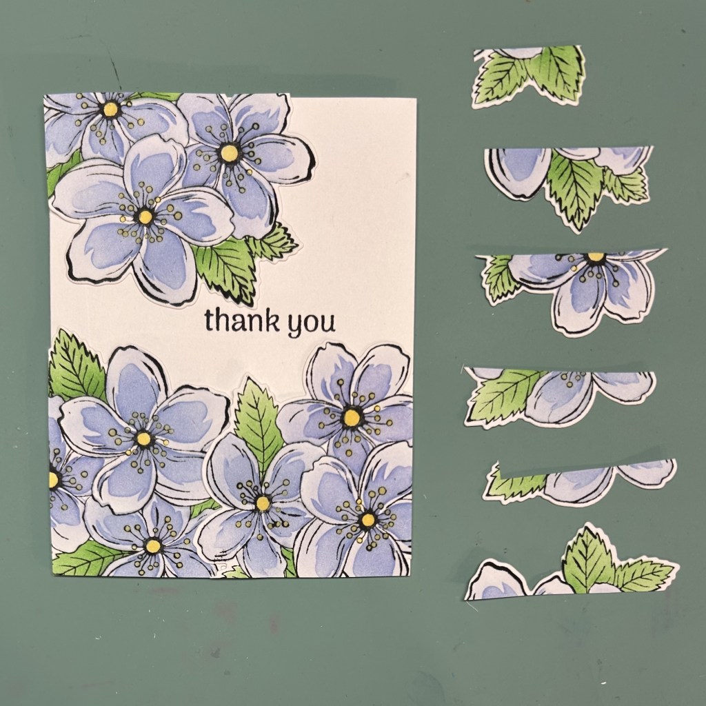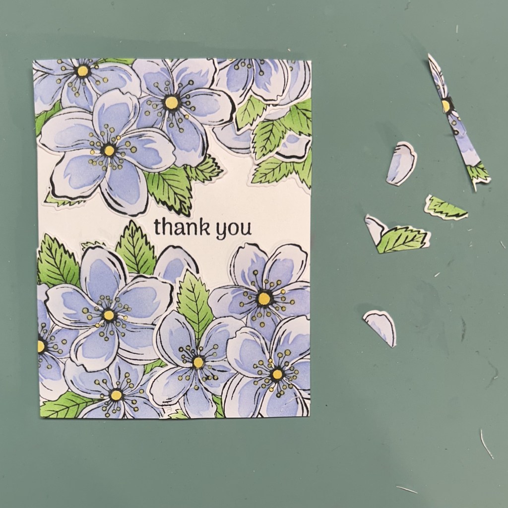 Because the flowered paper was so thin, I wanted to have adhesive behind the whole image and not just partially adhered as I might a thicker paper. I glued the thin paper directly onto the card front. The ‘spread’ end of the Tombow mono glue bottle worked very well to spread out the glue. I clean out and refill my Tombow bottles – I just remove the label to know that it is no longer the mono glue. I really like it as a dispenser with the versatility of both ends. Paint brushes and sponges are other ways to achieve a thin, even layer of glue over a complete surface. Another option would have been to adhere the flowers onto a sheet of double-sided adhesive paper before fussy cutting around them. There wouldn’t have been a need to deal with a wet adhesive with the potential mess of it as well as the tendancy that a wet adhesive can cause some wrinkles in thin paper.