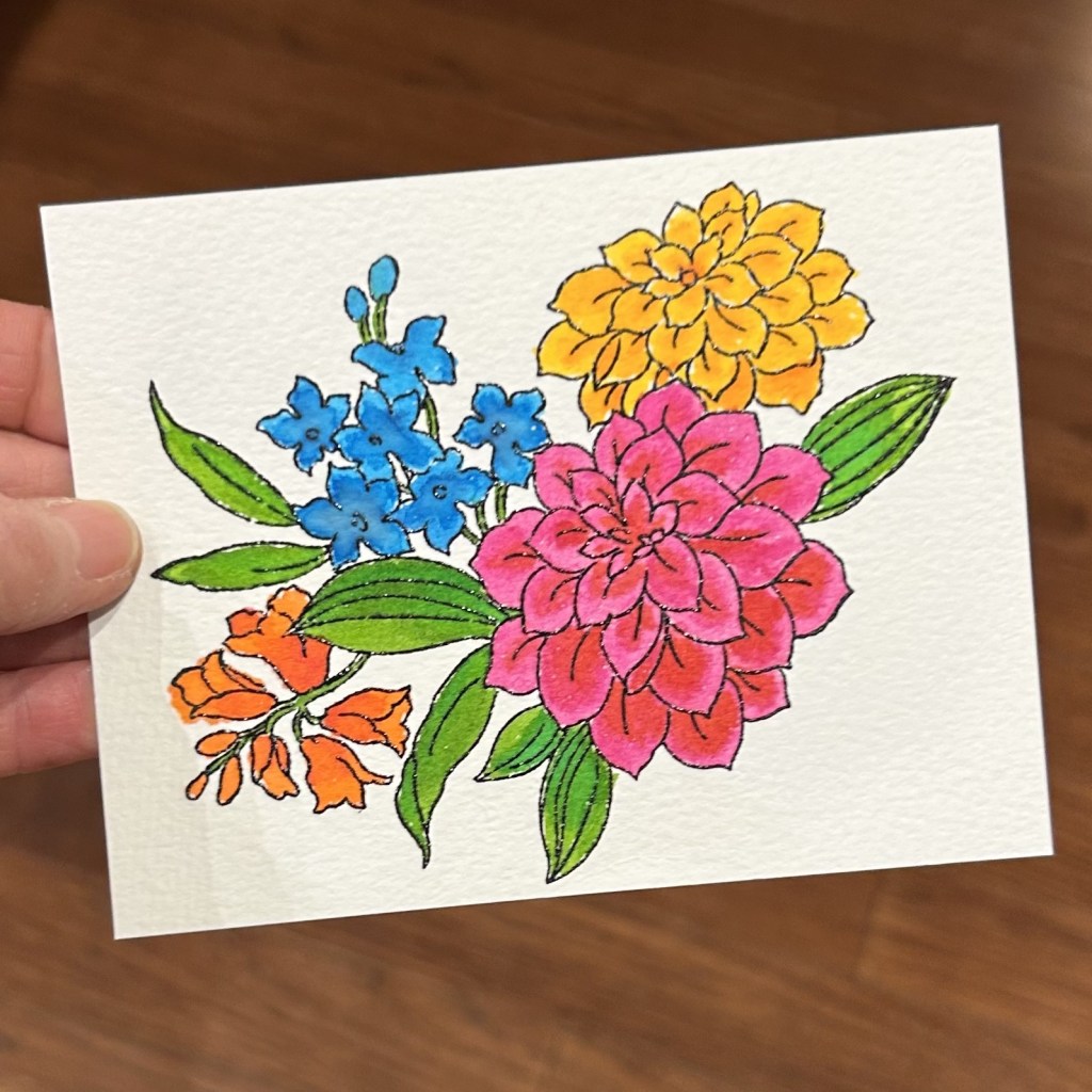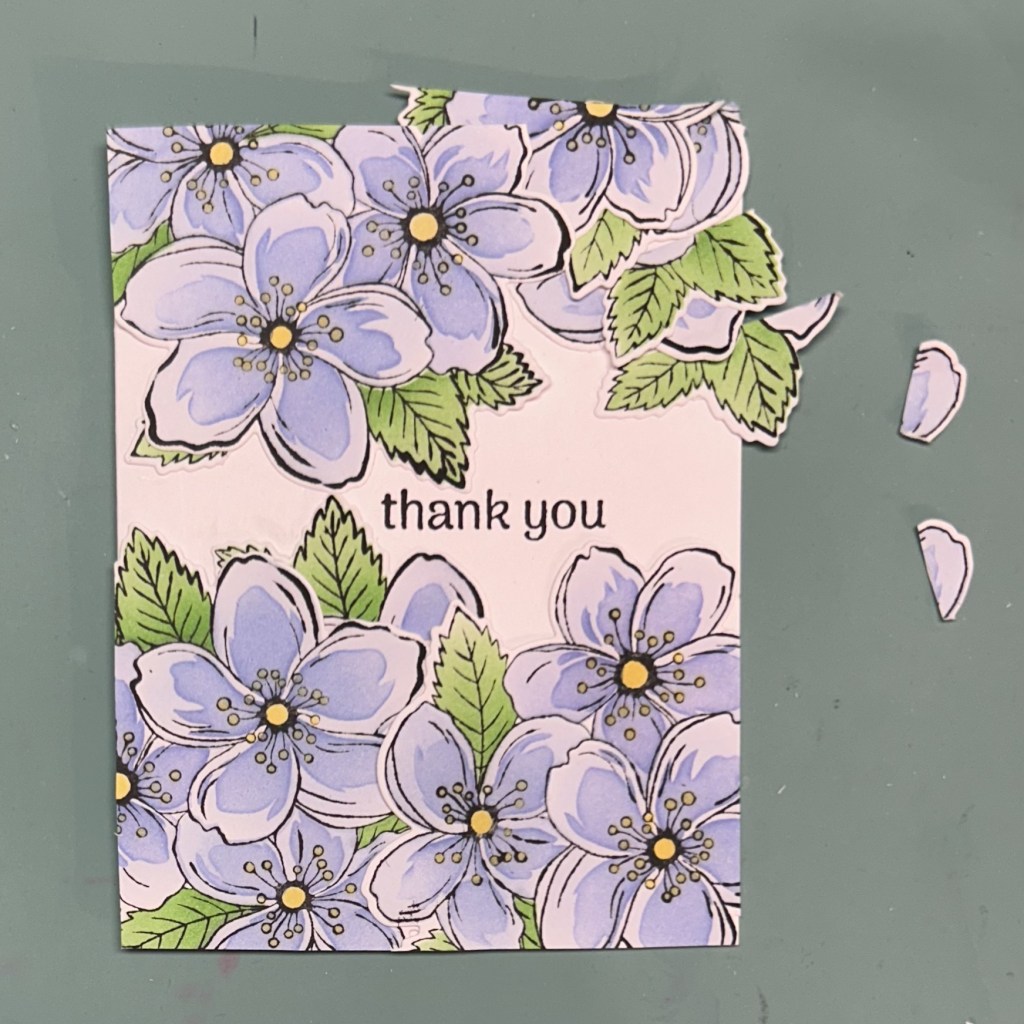 I did use a thin layer of liquid glue to adhere the flowers to the cardstock. I notice that it is lifing up in a few spots. I could have been more careful to make sure I had a good but thin layer covering the whole flower. Or I could have adhered the thin paper to adhesive backed cardstock or used a double-sided adhesive sheet to adhere the thin paper to the thicker cardstock.