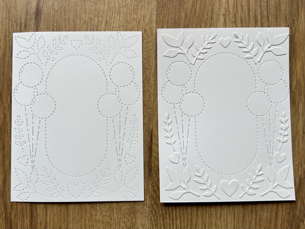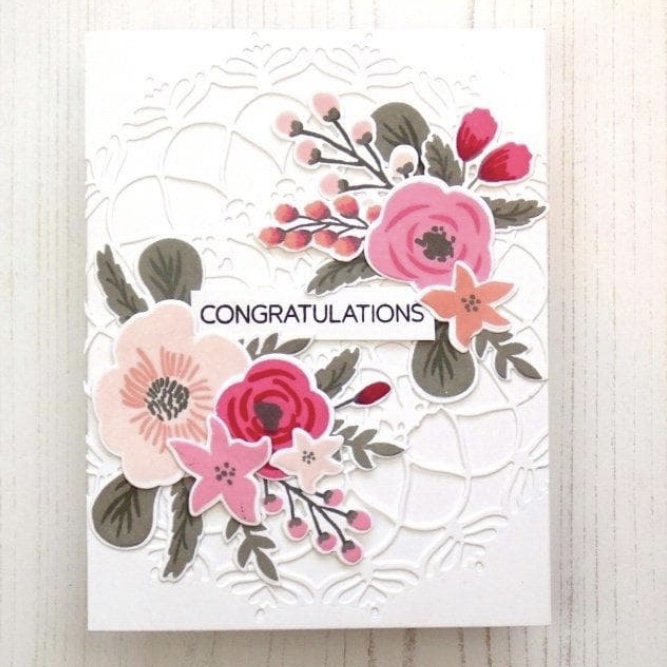 The card example from All About Layering 3 course – Lesson 5 from which I took the inspiration for using a background die. The die I used just had stitching with no cutouts. It will be nice to try a white diecut image on a white background as well, particularly a soft, curvy, lace-like pattern like the one in this sample card; most if not all of my coverplate dies are more graphic in design. Given the coverplate I used I opted for a centred single floral spray rather than having two sprays with the sentiment in the middle which is quite a nice look in this example card. The rounded coverplate die helps seems ground the floral sprays very well. I may try to create two floral sprays on the other background I made.