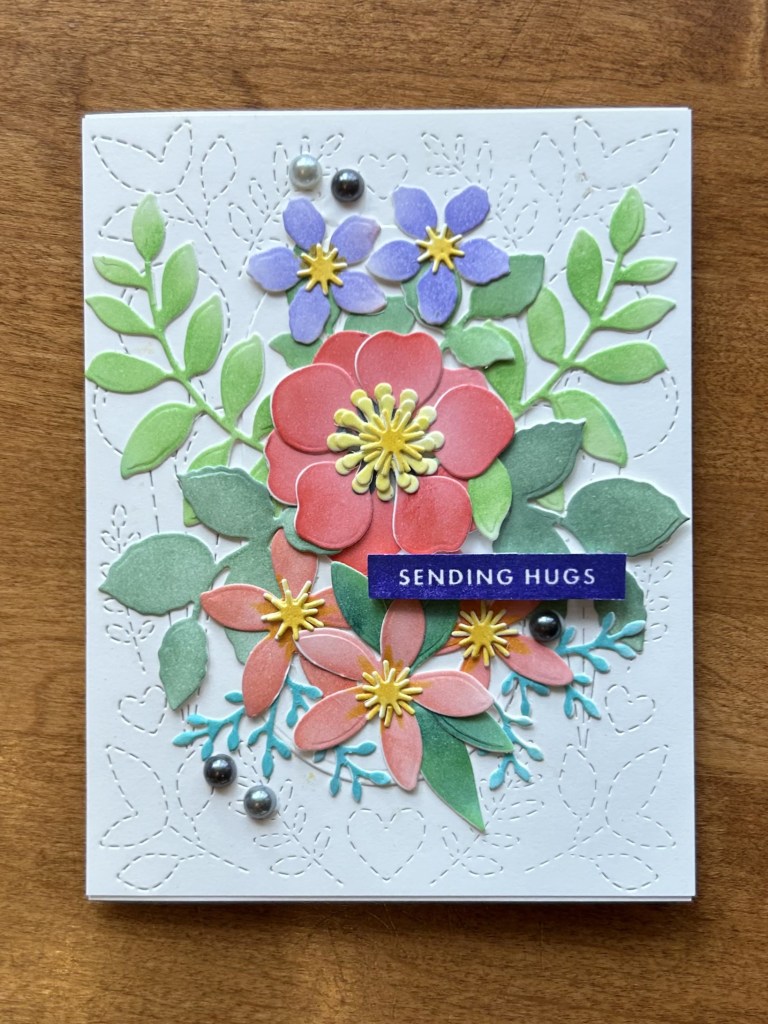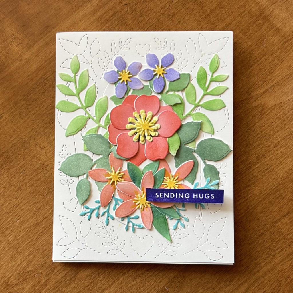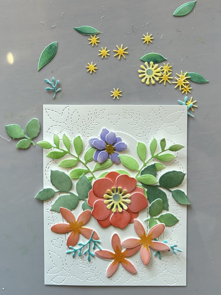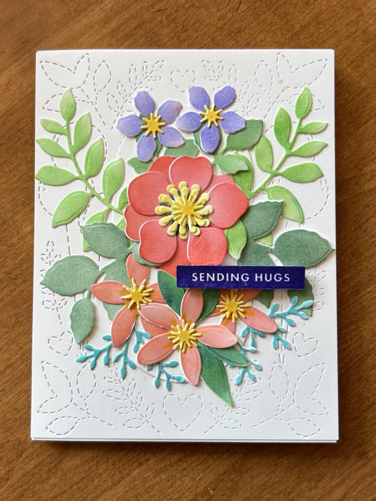 I used an Altenew zero waste die with ink blending stencils to colour and die cut the flowers. The background die is a Concord & 9th set from an SCT Crop and Create workshop. I opted to leave most of the leaf and heart stitched shapes showing and covered up the balloon portion because I didn’t think it went with the floral theme. I made an extra background using the coordinating die cuts which I’ll use for a future card.