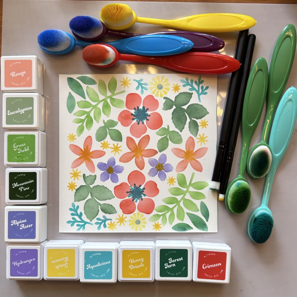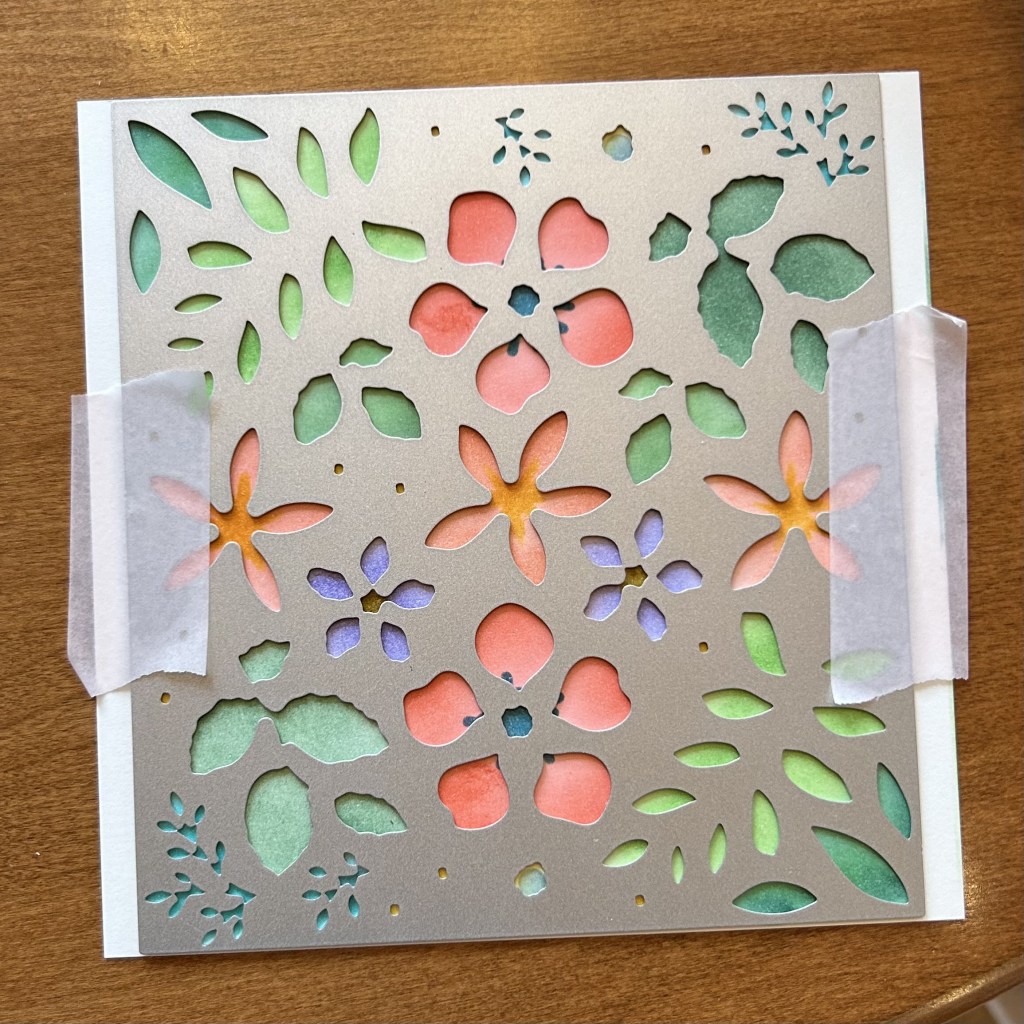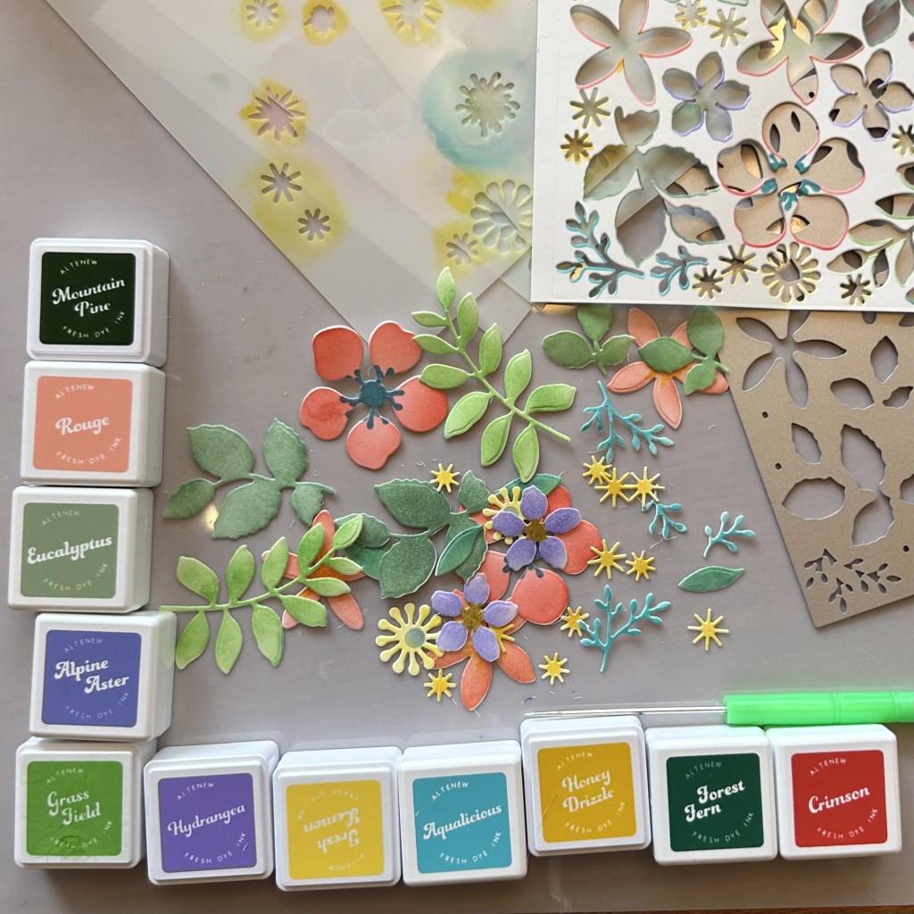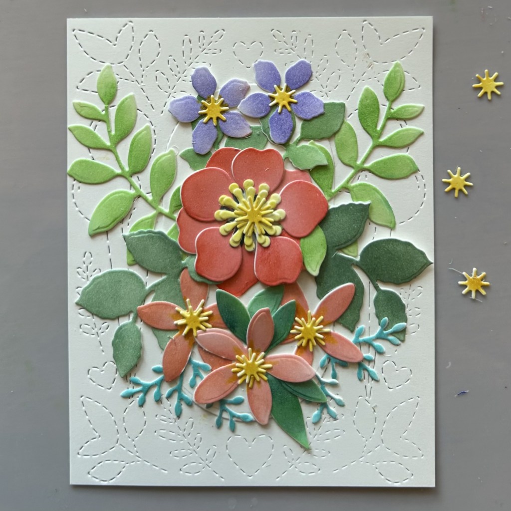 I used an Altenew zero waste die with ink blending stencils to colour and die cut the flowers. The background die is a Concord & 9th set from an SCT Crop and Create workshop. I opted to leave most of the leaf and heart stitched shapes showing and covered up the balloon portion because I didn’t think it went with the floral theme. I made an extra background using the coordinating die cuts which I’ll use for a future card.