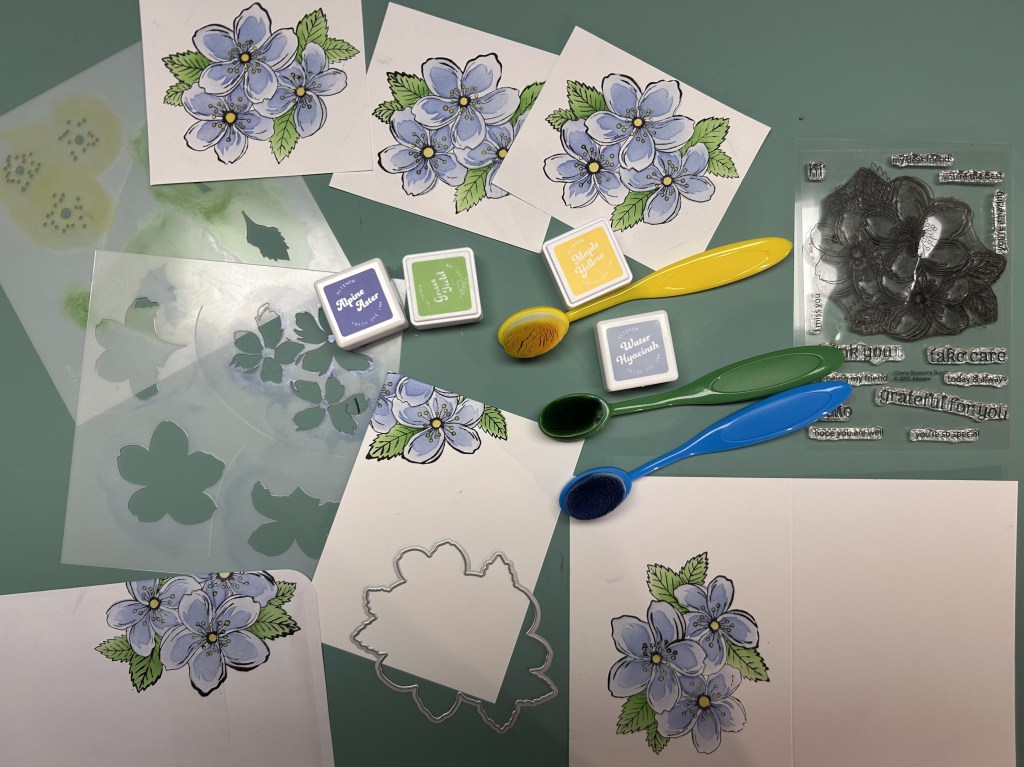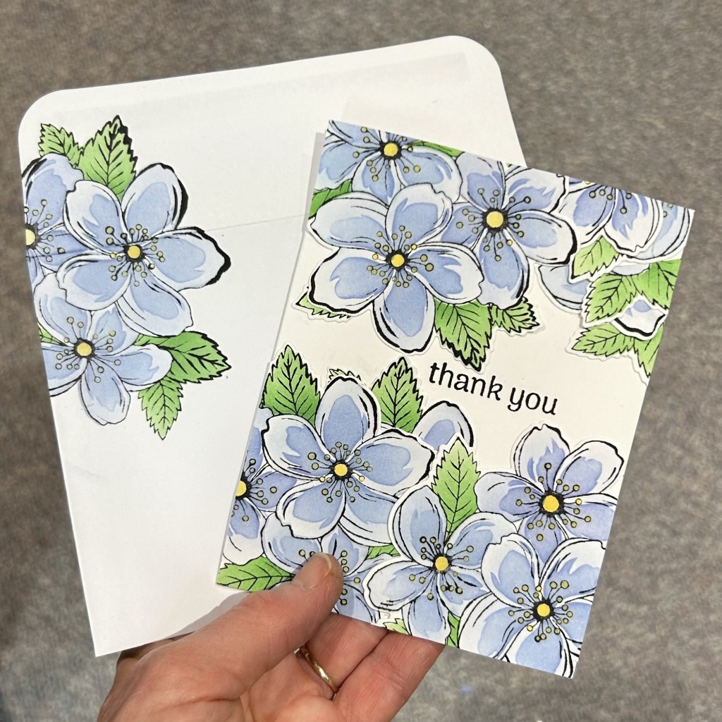 I created a card based on the design from All About Layering 4 – Lesson 1 using a layering stencil and the outline stamp from the Cherry Blossom Bunch set. I used Grayy Field, Maple Yellow, Water Hyacinth and Alpine Aster inks. I am very happy with how the card came out. I stamped the image three times and die cut it then used up almost all of the main images and the bits that I cut off to form the flower clusters at the top and the bottom of the card. I added a sentiment from the set into the middle of the card, slightly offset to the right and a bit above the middle of the card. It might have been nicer with a larger sentiment. I also stamped and ink blended the images for the front and flap of the envelope, the back of the card as well as for an inner layer on the inside of the card. Most of my friends think I am crazy for adding the extra details, but I really like having the extra details on my card projects. I love how easy it is to add colour to outline stamps using stencils and how relaxing the process of ink blending is.