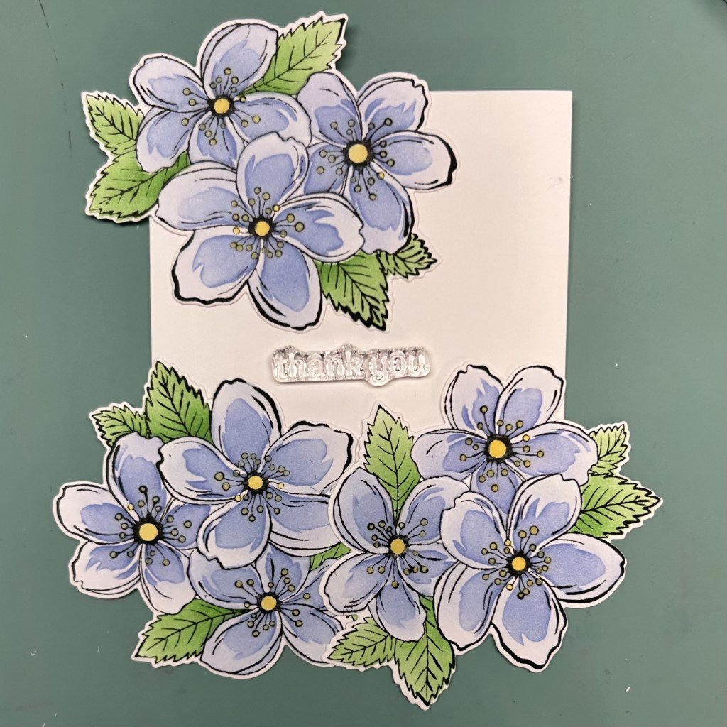 I noticed that the cardstock does curl up a bit. Using double sided adhesive paper to adhere the flowers would have prevented that curl. Or it might be better to glue the flowers onto a front panel then adhere the panel onto the card base. Or to adhere the flowers with glue to a cardstock then fussy cut around them – that would give them more dimension rather than the look of the thin flowers being right against the card layer.
